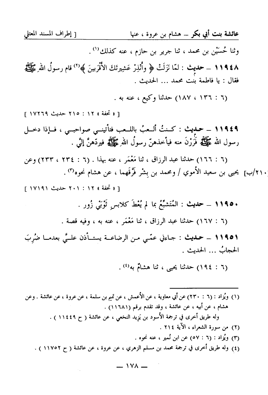 11949 -[م] حديث كنت ألعب باللعب فتأتيني صواحبي فإذا دخل رسول الله صَلَّى اللَّهُ عَلَيْهِ وَسَلَّمَ فررن منه فيأخذهن رسول الله صَلَّى اللَّهُ عَلَيْهِ وَسَلَّمَ فيردهن إلي (6: 166) حدثنا عبد الرزاق ثنا معمر عنه بهذا (6: 234، 233) وعن يحيى بن سعيد الأموي ومحمد بن بشر فرقهما عن هشام نحوه