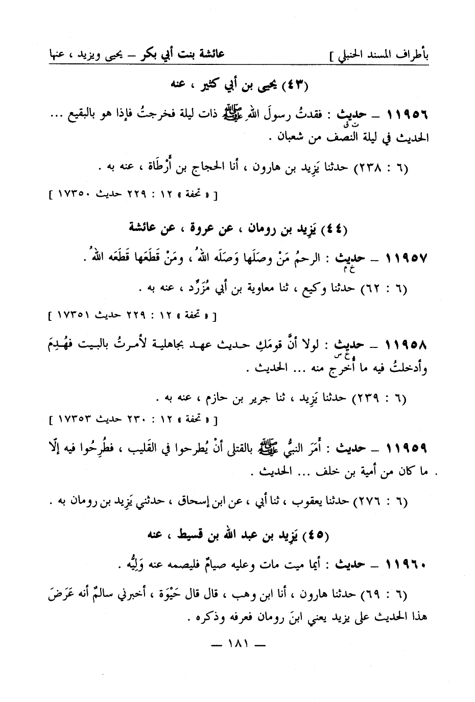 [تحفة 12: 229 حديث 17350] (44) يزيد بن رومان عن عروة عن عائشة