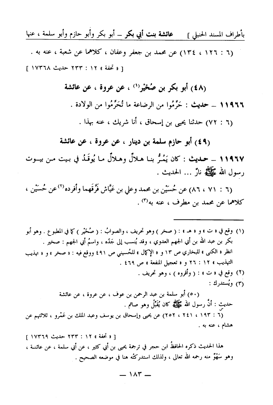 11967 - حديث كان يمر بنا هلال وهلال ما يوقد في بيت من بيوت رسول الله صَلَّى اللَّهُ عَلَيْهِ وَسَلَّمَ نار ... ... . الحديث (6: 71، 86) عن حسين بن محمد وعلي بن عياش فرقهما وأفرده عن حسين كلاهما عن محمد بن مطرف عنه به -[184]- ابن حزم عن عروة عن عائشة هو عبد الله بن أبي بكر تقدم (ح 11701) آخر ترجمة عروة بن الزبير عن عائشة رضي الله عنها