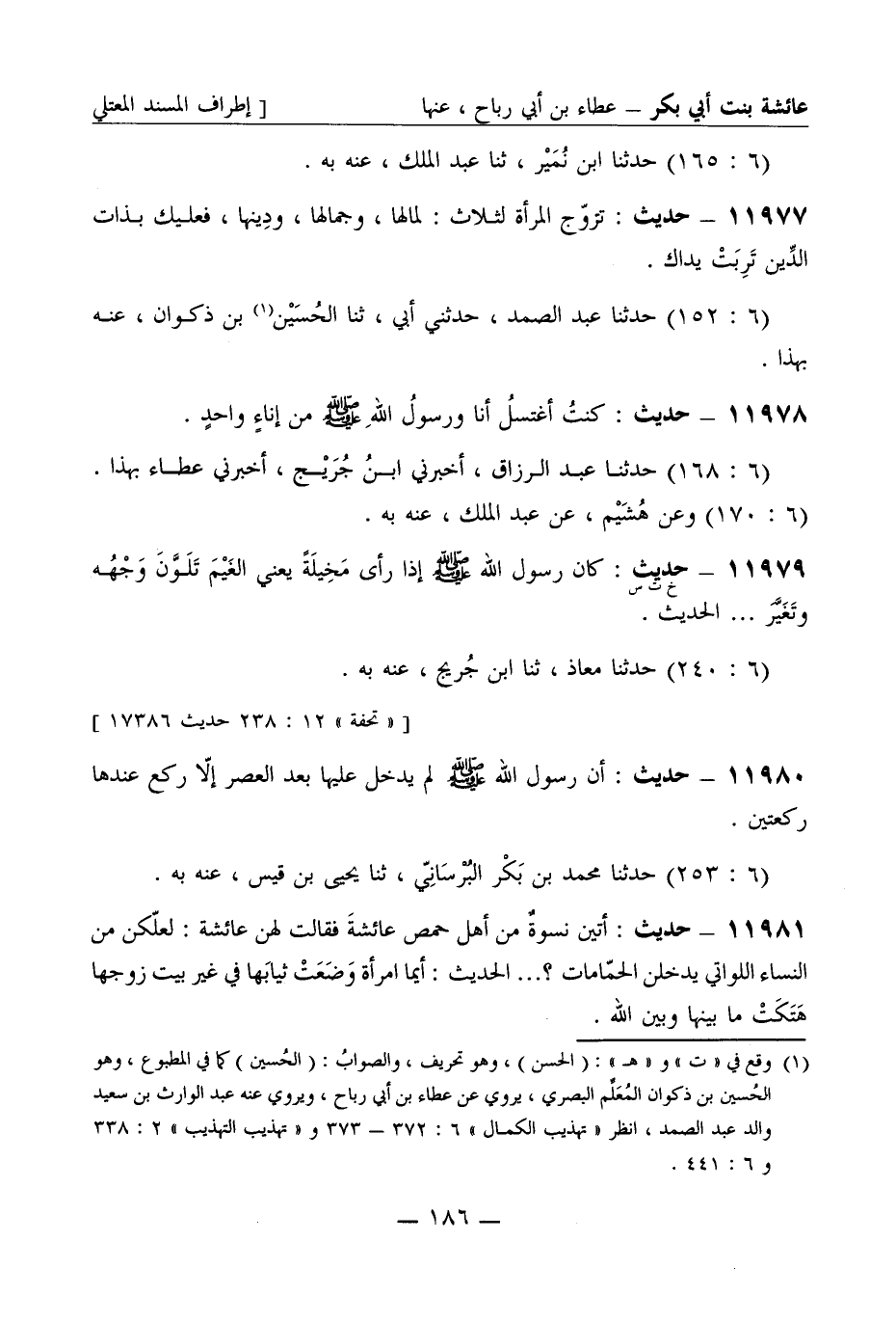 11977 - حديث: تزوج المرأة لثلاث: لمالها وجمالها ودينها فعليك بذات الدين تربت يداك (6: 152) حدثنا عبد الصمد حدثني أبي ثنا الحسين بن ذكوان عنه بهذا