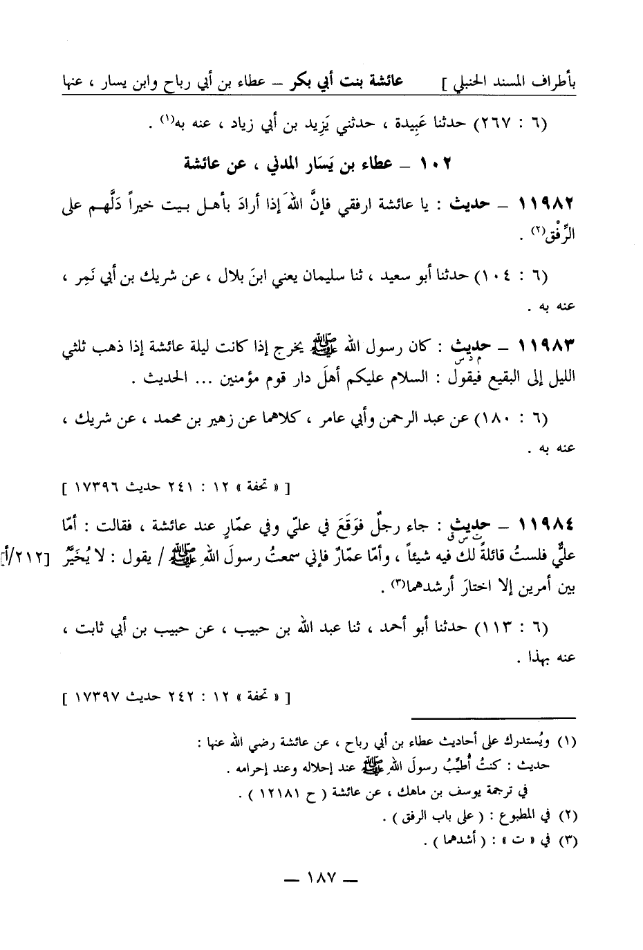 11982 - حديث: يا عائشة ارفقي فإن الله إذا أراد بأهل بيت خيرا دلهم على الرفق (6: 104) حدثنا أبو سعيد، ثنا سليمان يعني ابن بلال عن شريك بن أبي نمر عنه به