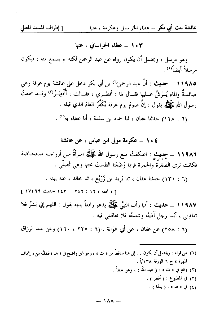 11985 - حديث أن عبد الرحمن بن أبي بكر دخل على عائشة يوم عرفة وهي صائمة والماء يرش عليها فقال لها أفطري فقالت أأفطر وقد سمعت رسول الله صَلَّى اللَّهُ عَلَيْهِ وَسَلَّمَ يقول إن صوم يوم عرفة يكفر العام الذي قبله (6: 128) حدثنا عفان ثنا حماد بن سلمة أنا عطاء به.