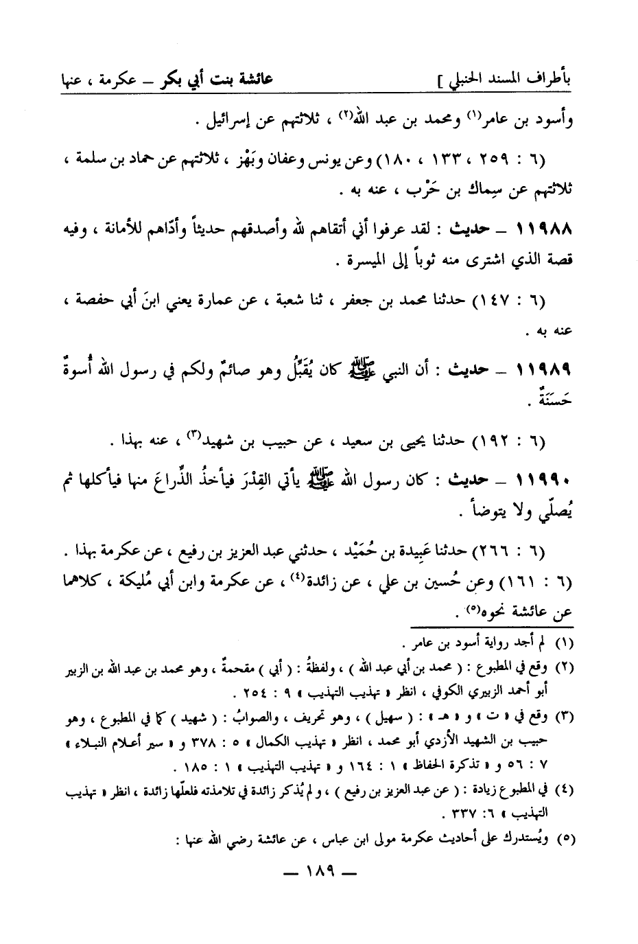 11990 - حديث كان رسول الله صَلَّى اللَّهُ عَلَيْهِ وَسَلَّمَ يأتي القدر فيأخذ الذراع منها فيأكلها ثم يصلي ولا يتوضأ (6: 266) حدثنا عبيدة بن حميد حدثني عبد العزيز بن رفيع عن عكرمة بهذا (6: 161) وعن حسين بن علي عن زائدة عن عكرمة وابن أبي مليكة كلاهما عن عائشة نحوه
