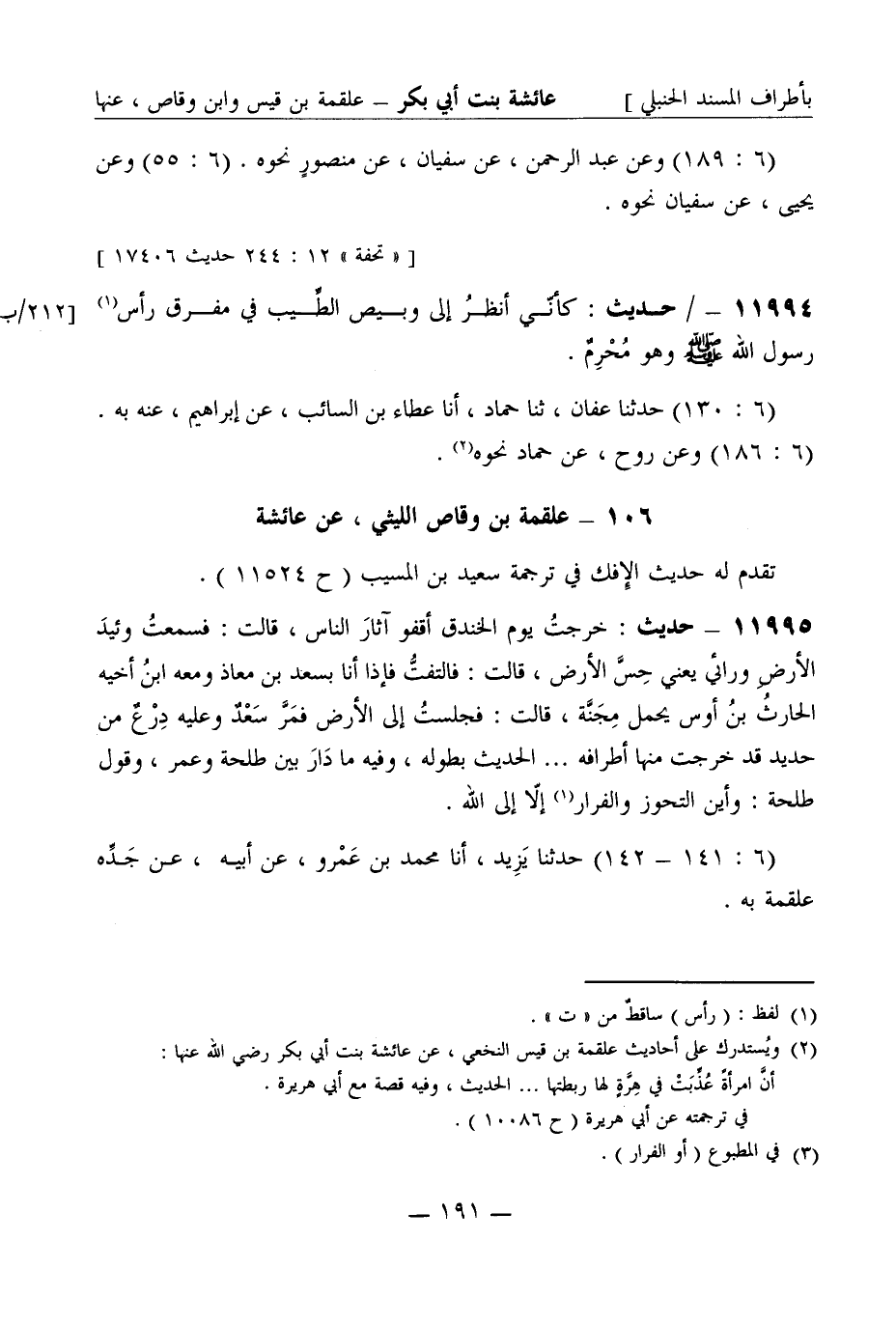 11995 - حديث خرجت يوم الخندق أقفو آثار الناس قالت فسمعت وئيد الأرض ورائي يعني حس الأرض قالت فالتفت فإذا أنا بسعد بن معاذ ومعه ابن أخيه الحارث بن أوس يحمل مجنة قالت فجلست إلى الأرض فمر سعد وعليه درع من حديد قد خرجت منها أطرافه ... . الحديث بطوله، وفيه ما دار بين طلحة وعمر وقول طلحة وأين التحوز والفرار إلا إلى الله. (6: 141 - 142) حدثنا يزيد أنا محمد بن عمرو عن أبيه عن جده علقمة به