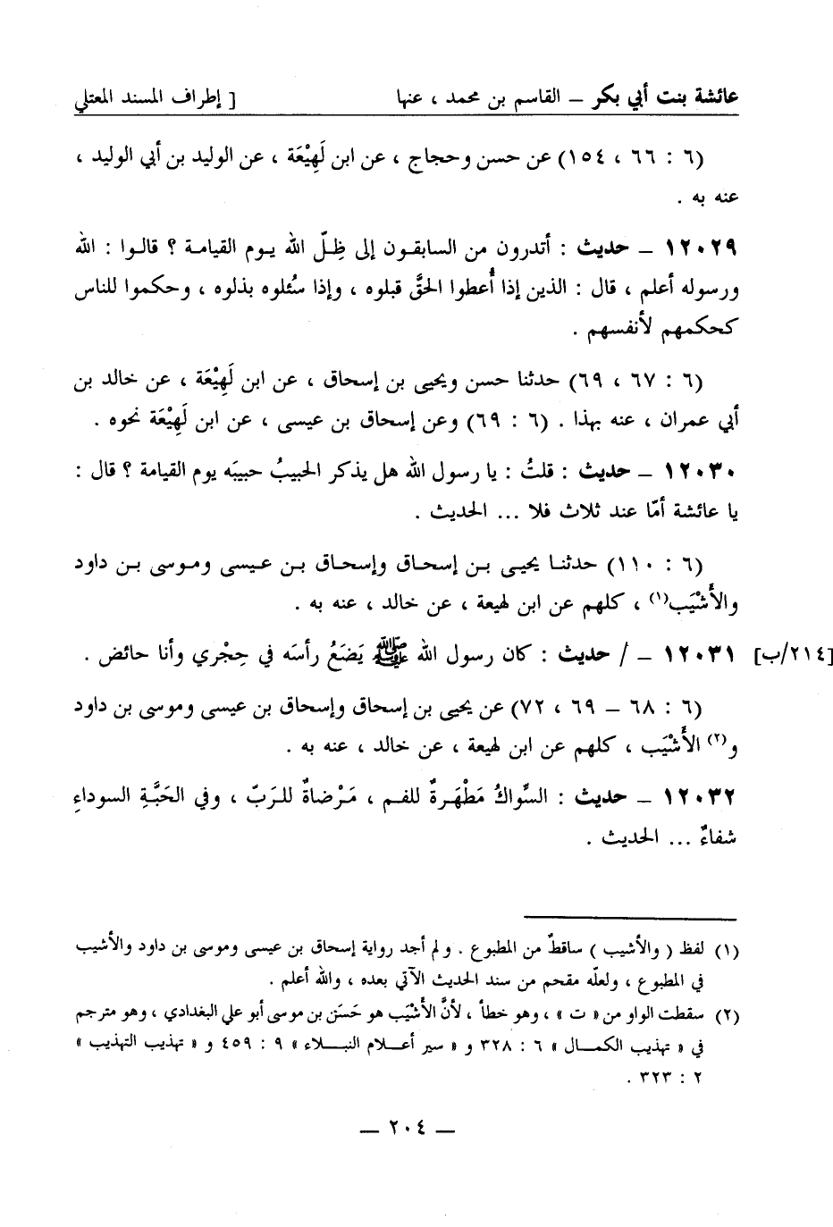 12031 - حديث كان رسول الله صَلَّى اللَّهُ عَلَيْهِ وَسَلَّمَ يضع رأسه في حجري وأنا حائض (6: 68 - 69، 72) عن يحيى بن إسحاق وإسحاق بن عيسى وموسى بن داود والأشيب كلهم عن ابن لهيعة عن خالد عنه به
