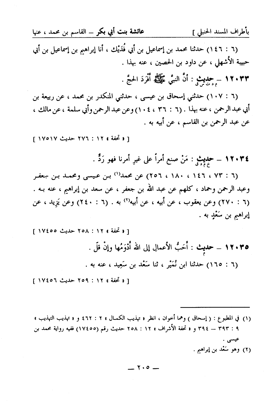 12034 -[خ م د ق] حديث: من صنع أمرا على غير أمرنا فهو رد (6: 73، 146، 180، 256) عن محمد بن عيسى ومحمد بن جعفر وعبد الرحمن وحماد كلهم عن عبد الله بن جعفر عن سعد بن إبراهيم عنه به (6: 270) وعن يعقوب، عن أبيه، عن أبيه به (6: 240) وعن يزيد، عن إبراهيم بن سعد به.