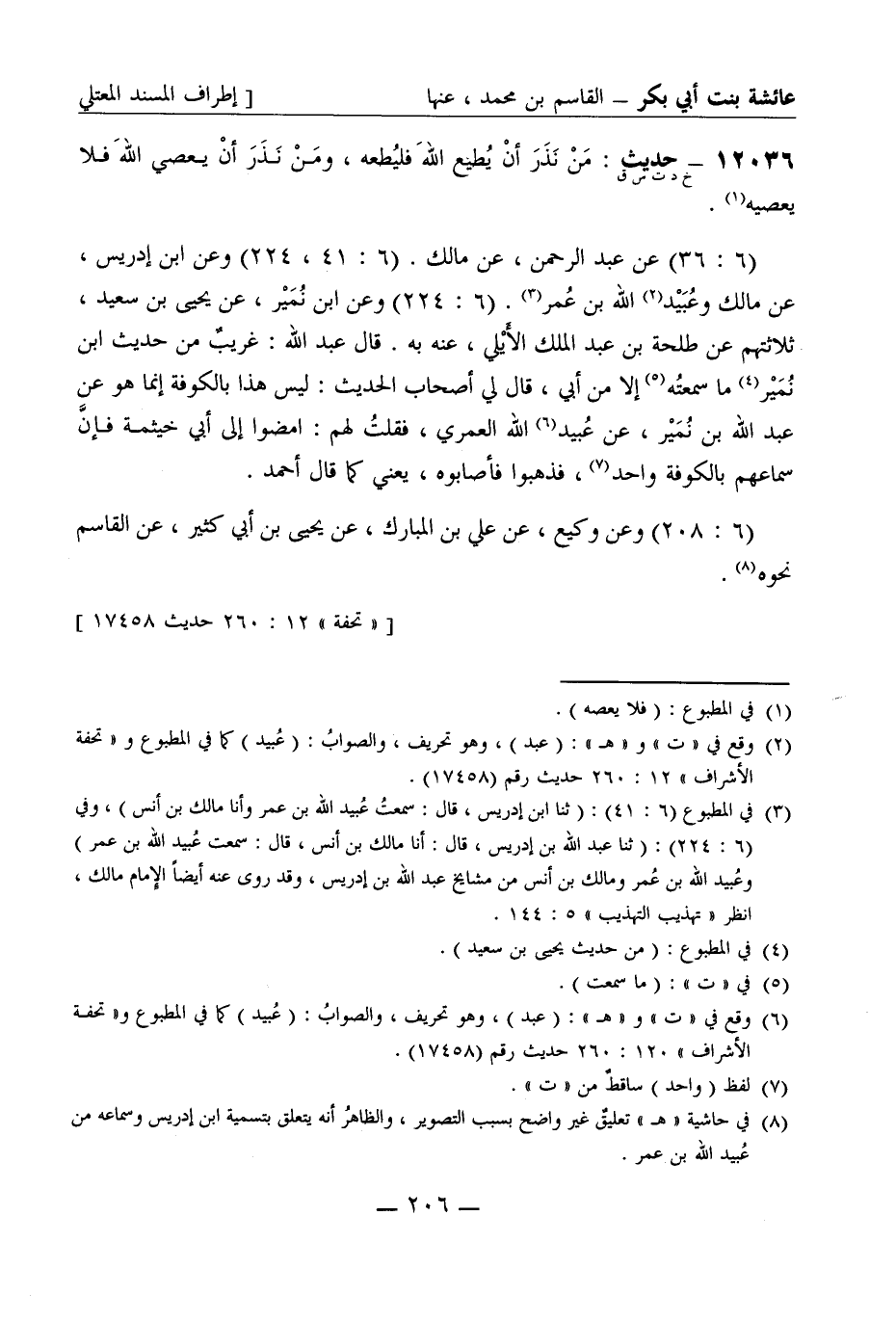 12036 -[خ د ت س ق] حديث من نذر أن يطيع الله فليطعه ومن نذر أن يعصي الله فلا يعصيه (6: 36) عن عبد الرحمن، عن مالك (6: 41، 224) وعن ابن إدريس عن مالك وعبيد الله بن عمر (6: 224) وعن ابن نمير عن يحيى بن سعيد ثلاثتهم عن طلحة بن عبد الملك الأيلي عنه به قال عبد الله غريب من حديث ابن نمير ما سمعته إلا من أبي قال لي أصحاب الحديث ليس هذا بالكوفة إنما هو عن عبد الله بن نمير عن عبيد الله العمري فقلت لهم امضوا إلى أبي خيثمة فإن سماعهم بالكوفة واحد فذهبوا فأصابوه يعني كما قال أحمد. (6: 208) وعن وكيع، عن علي بن المبارك عن يحيى بن أبي كثير، عن القاسم نحوه