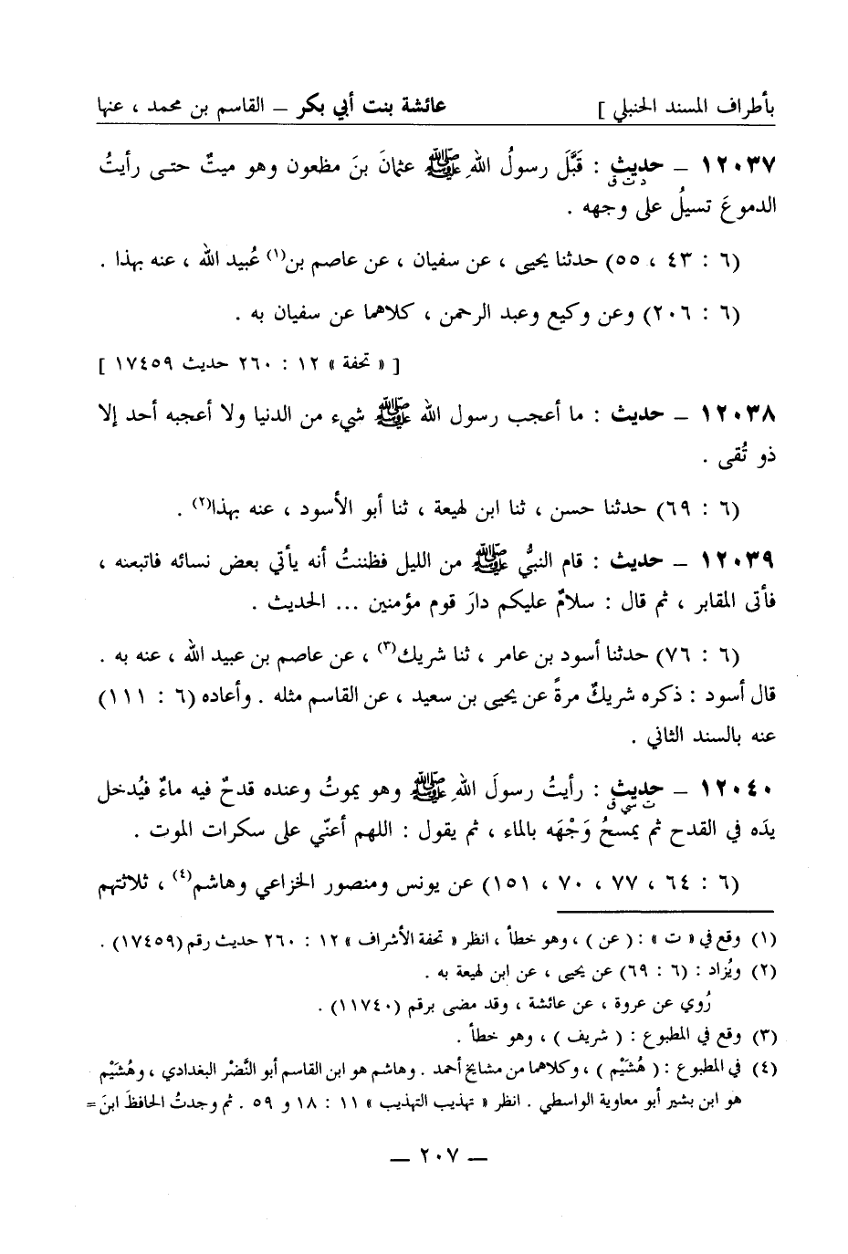 12040 -[ت سي ق] حديث: رأيت رسول الله صَلَّى اللَّهُ عَلَيْهِ وَسَلَّمَ وهو يموت وعنده قدح فيه ماء فيدخل يده في القدح ثم يمسح وجهه بالماء ثم يقول: اللهم أعني على سكرات الموت (6: 64، 77، 70، 151) عن يونس ومنصور الخزاعي وهاشم، ثلاثتهم -[208]- عن الليث بن سعد عن يزيد بن الهاد عن موسى بن سرجس، عن القاسم به.