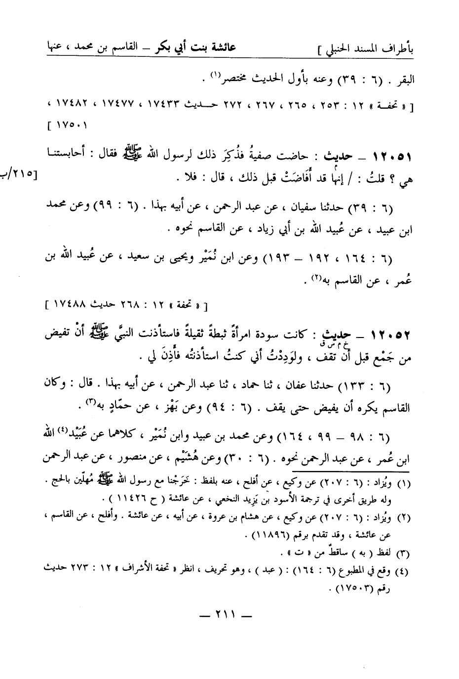 12051 -[م] حديث حاضت صفية فذكر ذلك لرسول الله صَلَّى اللَّهُ عَلَيْهِ وَسَلَّمَ فقال أحابستنا هي؟ قلت إنها قد أفاضت قبل ذلك قال فلا (6: 39) حدثنا سفيان عن عبد الرحمن عن أبيه بهذا (6: 99) وعن محمد بن عبيد عن عبيد الله بن أبي زياد عن القاسم نحوه. (6: 164، 192 - 193) وعن ابن نمير ويحيى بن سعيد عن عبيد الله بن عمر، عن القاسم به