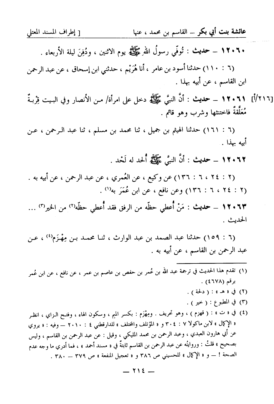 12063 - حديث من أعطي حظه من الرفق فقد أعطي حظه من الخير ... . الحديث (6: 159) حدثنا عبد الصمد بن عبد الوارث ثنا محمد بن مهزم عن عبد الرحمن بن القاسم عن أبيه به