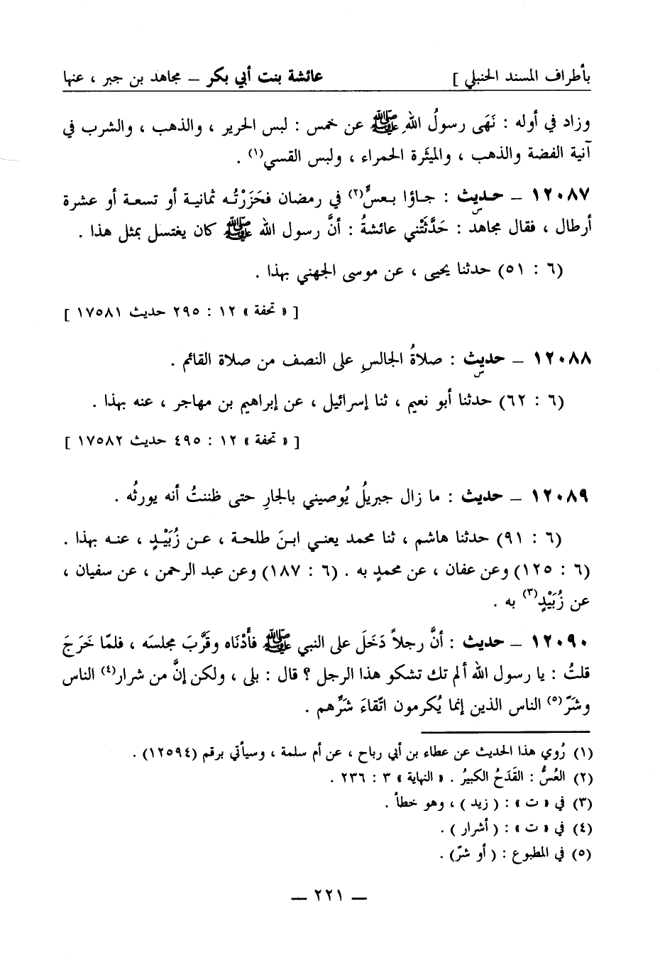 12089 - حديث ما زال جبريل يوصيني بالجار حتى ظننت أنه يورثه (6: 91) حدثنا هاشم ثنا محمد يعني ابن طلحة عن زبيد عنه بهذا (6: 125) وعن عفان عن محمد به (6: 187) وعن عبد الرحمن عن سفيان عن زبيد به