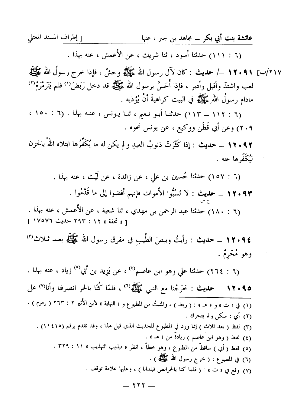 12092 - حديث إذا كثرت ذنوب العبد ولم يكن له ما يكفرها ابتلاه الله بالحزن ليكفرها عنه (6: 157) حدثنا حسين بن علي عن زائدة عن ليث عنه بهذا
