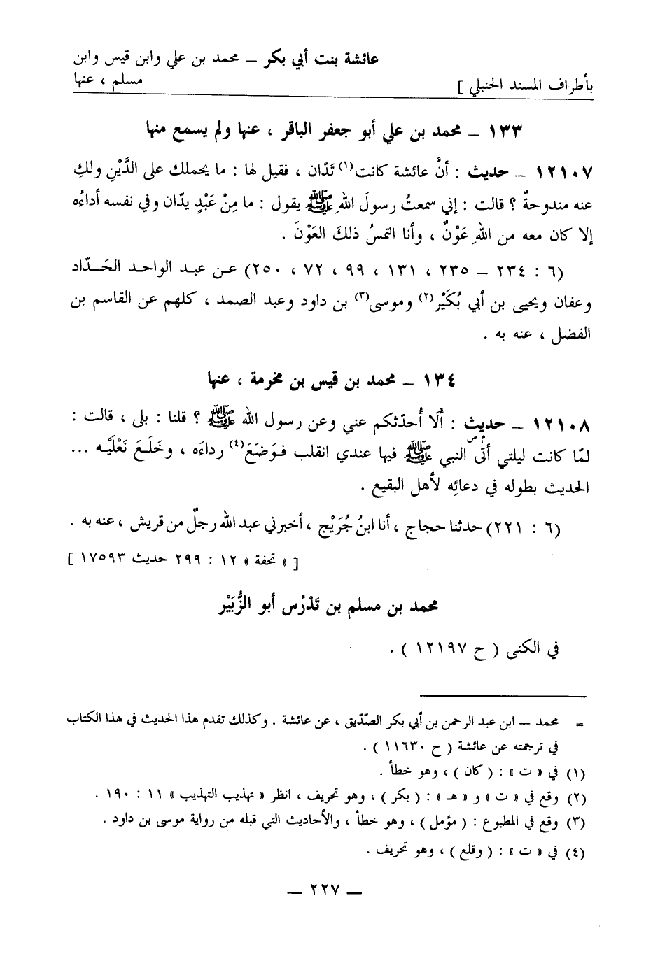 12107 - حديث أن عائشة كانت تدان فقيل لها ما يحملك على الدين ولك عنه مندوحة؟ قالت إني سمعت رسول الله صَلَّى اللَّهُ عَلَيْهِ وَسَلَّمَ يقول ما من عبد يدان وفي نفسه أداءه إلا كان معه من الله عون وأنا ألتمس ذلك العون (6: 234 - 235، 131، 99، 72، 250) عن عبد الواحد الحداد وعفان ويحيى بن أبي بكير وموسى بن داود وعبد الصمد، كلهم عن القاسم بن الفضل عنه به