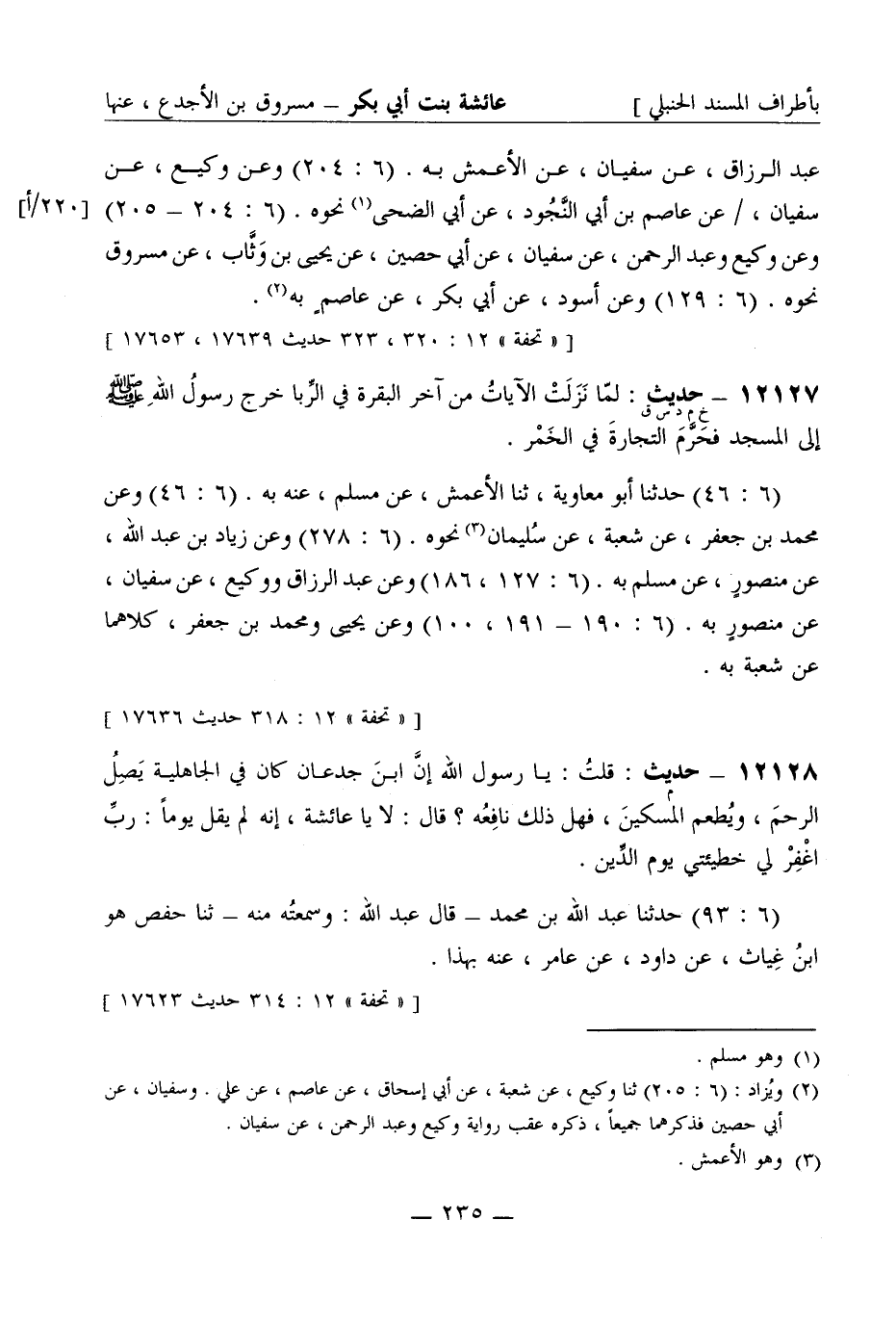 12127 -[خ م د س ق] حديث: لما نزلت الآيات من آخر البقرة في الربا خرج رسول الله صَلَّى اللَّهُ عَلَيْهِ وَسَلَّمَ إلى المسجد فحرم التجارة في الخمر (6: 46) حدثنا أبو معاوية ثنا الأعمش عن مسلم عنه به (6: 46) وعن محمد بن جعفر عن شعبة عن سليمان نحوه (6: 278) وعن زياد بن عبد الله عن منصور عن مسلم به (6: 127، 186) وعن عبد الرزاق ووكيع، عن سفيان، عن منصور به. (6: 190 - 191، 100) وعن يحيى ومحمد بن جعفر كلاهما عن شعبة به
