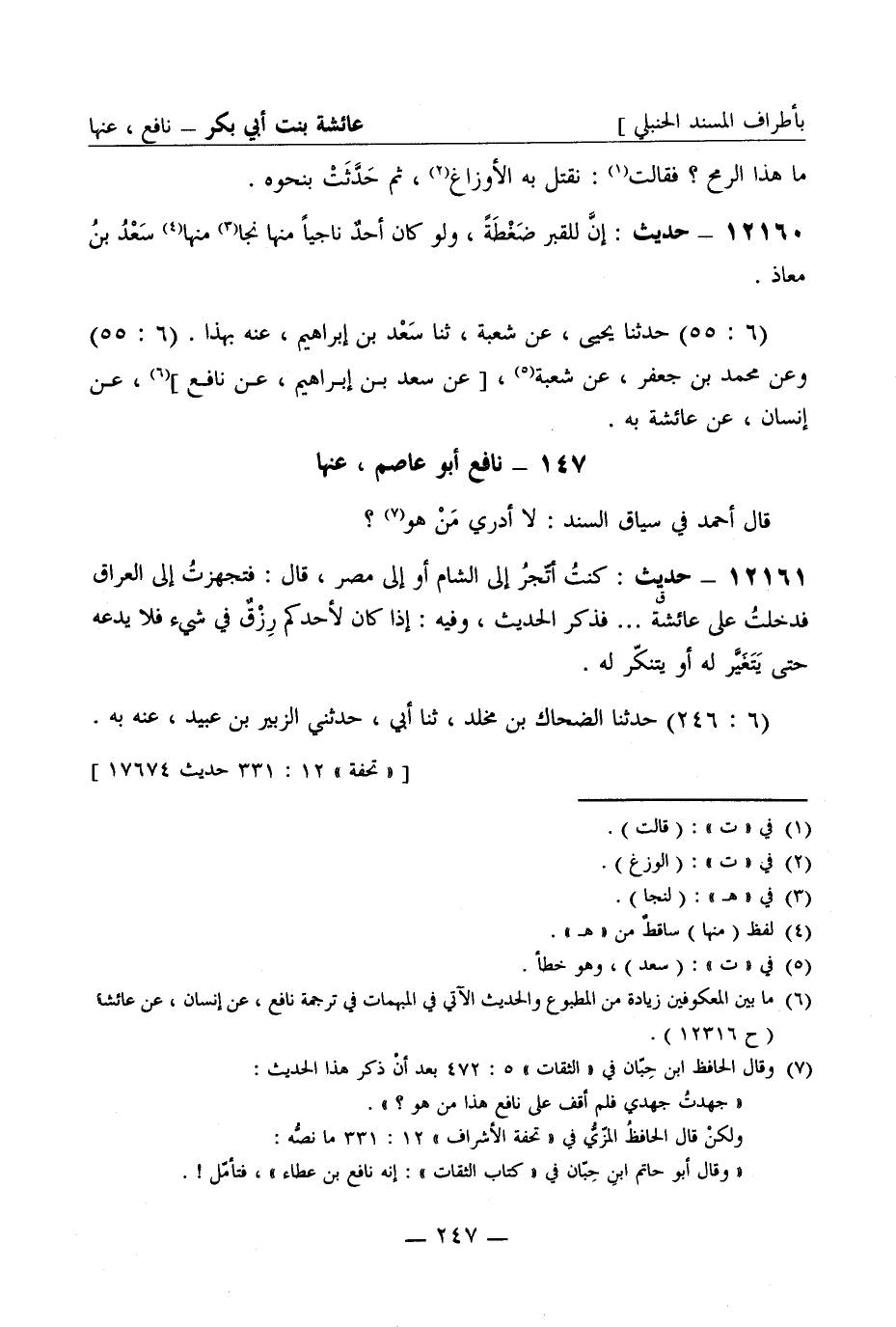 12159 - حديث إن للقبر ضغطة ولو كان أحد ناجيا منها نجا منها سعد بن معاذ (6: 55) حدثنا يحيى عن شعبة ثنا سعد بن إبراهيم عنه بهذا (6: 55) وعن محمد بن جعفر عن شعبة [عن سعد بن إبراهيم عن نافع] عن إنسان عن عائشة به