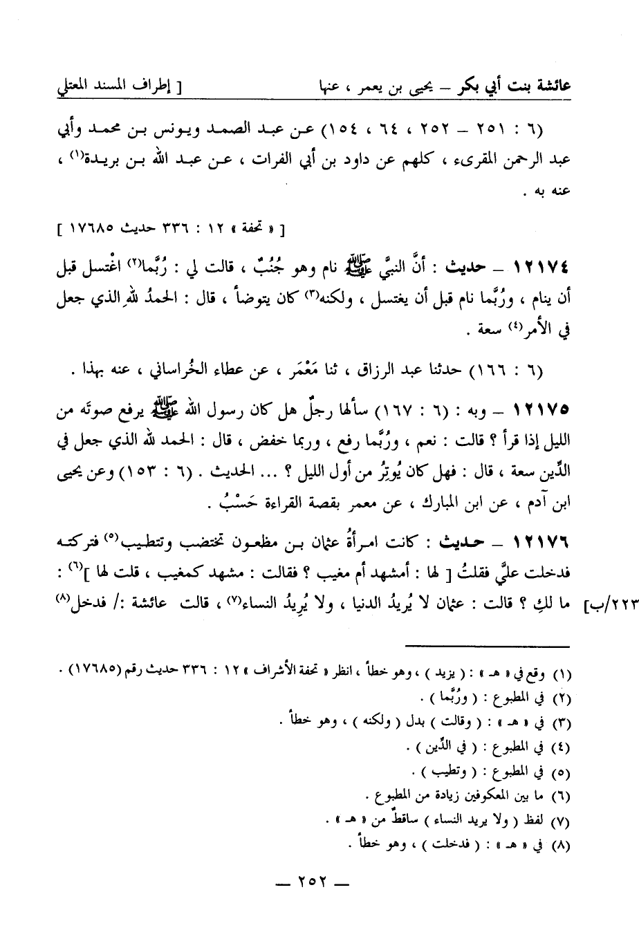 12175 - حديث كانت امرأة عثمان بن مظعون تختضب وتتطيب فتركته فدخلت علي فقلت [لها أمشهد أم مغيب؟ فقالت مشهد كمغيب قلت لها] ما لك؟ قالت عثمان لا يريد الدنيا ولا يريد النساء قالت عائشة فدخل -[253]- علي رسول الله صَلَّى اللَّهُ عَلَيْهِ وَسَلَّمَ فأخبرته بذلك فلقي عثمان فقال يا عثمان أتؤمن بما نؤمن به؟ قال نعم يا رسول الله قال فأسوة مالك بنا (6: 106) حدثنا مؤمل ثنا حماد ثنا إسحاق بن سويد عنه بهذا (6: 106) وعن مؤمل عن حماد عن إسحاق عن أبي فاختة عن عائشة نحوه