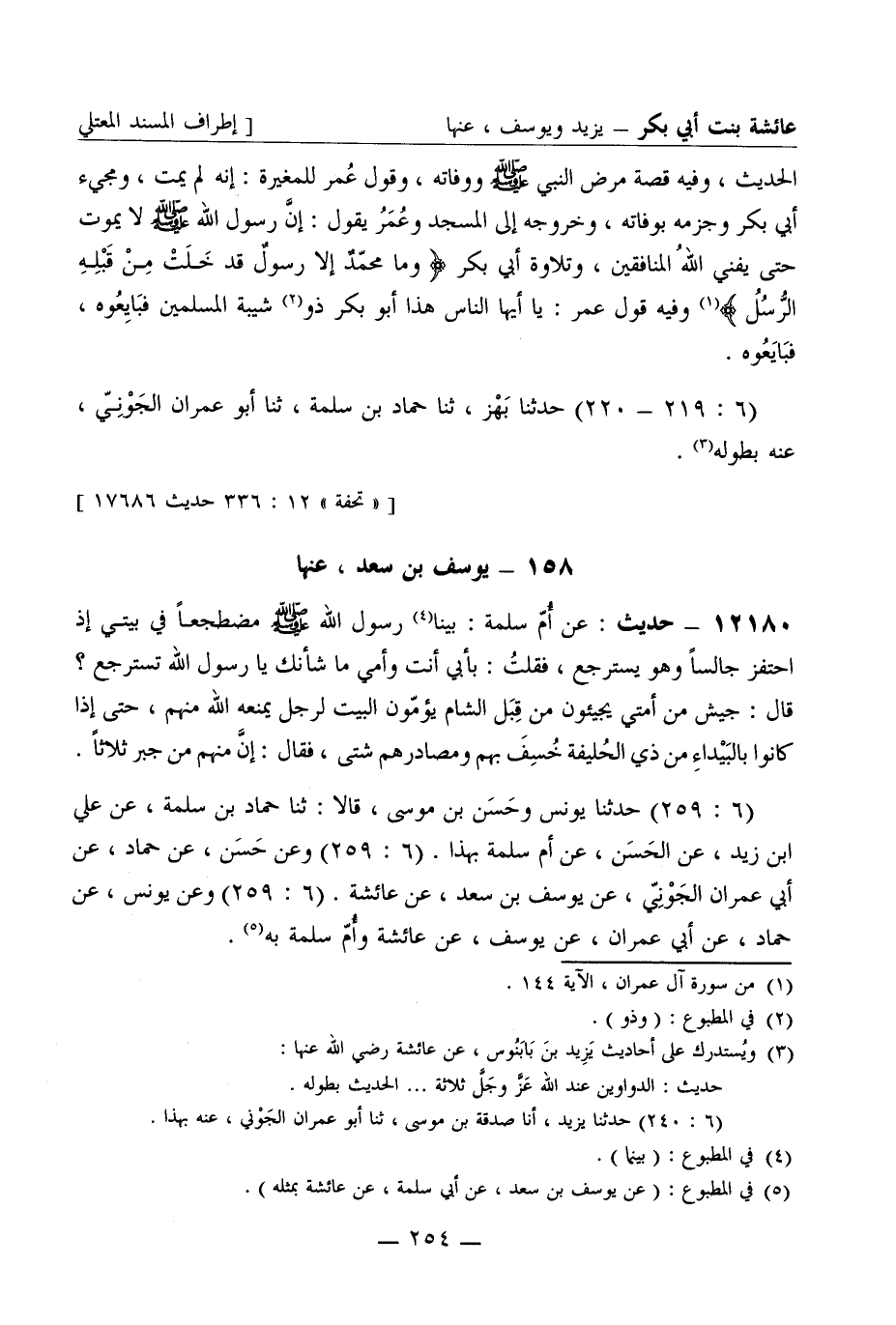 12179 - حديث عن أم سلمة بينا رسول الله صَلَّى اللَّهُ عَلَيْهِ وَسَلَّمَ مضطجعا في بيتي إذ احتفز جالسا وهو يسترجع فقلت بأبي أنت وأمي ما شأنك يا رسول الله تسترجع؟ قال جيش من أمتي يجيئون من قبل الشام يؤمون البيت لرجل يمنعه الله منهم، حتى إذا كانوا بالبيداء من ذي الحليفة خسف بهم ومصادرهم شتى فقال إن منهم من جبر ثلاثا (6: 259) حدثنا يونس وحسن بن موسى قالا ثنا حماد بن سلمة عن علي بن زيد عن الحسن عن أم سلمة بهذا (6: 259) وعن حسن عن حماد عن أبي عمران الجوني عن يوسف بن سعد عن عائشة (6: 259) وعن يونس عن حماد عن أبي عمران عن يوسف عن عائشة وأم سلمة به