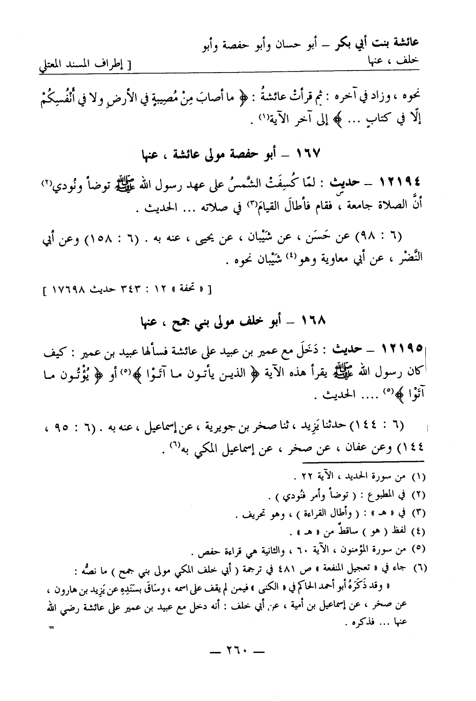 12195 - حديث دخل مع عمير بن عبيد على عائشة فسألها عبيد بن عمير كيف كان رسول الله صَلَّى اللَّهُ عَلَيْهِ وَسَلَّمَ يقرأ هذه الآية الذين يأتون ما آتوا أو يؤتون ما آتوا ... . الحديث (6: 144) حدثنا يزيد ثنا صخر بن جويرية عن إسماعيل، عنه به، (6: 95، 144) وعن عفان، عن صخر، عن إسماعيل المكي به