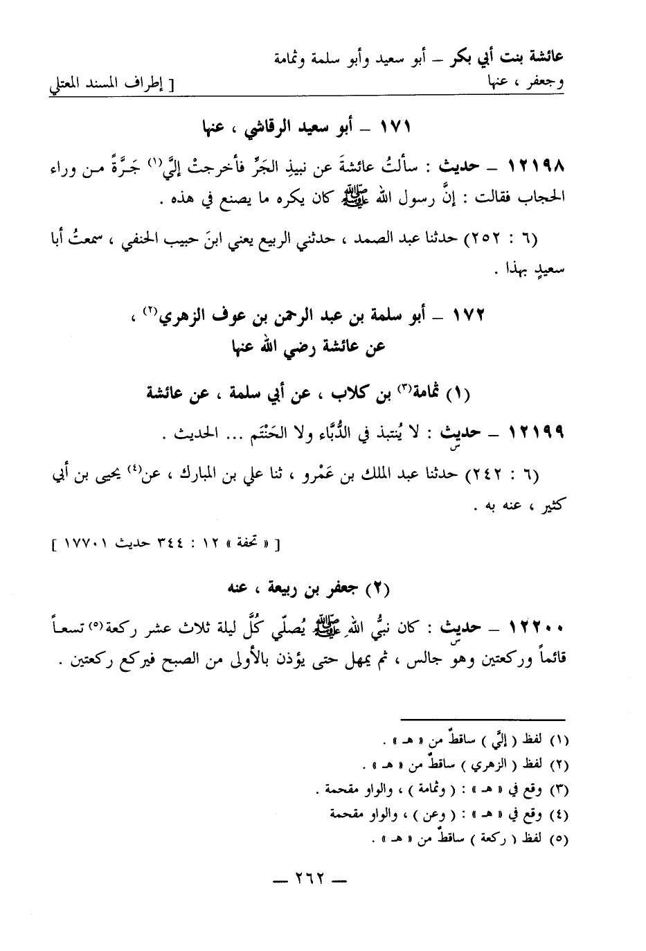 12198 - حديث سألت عائشة عن نبيذ الجر فأخرجت إلي جرة من وراء الحجاب فقالت إن رسول الله صَلَّى اللَّهُ عَلَيْهِ وَسَلَّمَ كان يكره ما يصنع في هذه (6: 252) حدثنا عبد الصمد حدثني الربيع يعني ابن حبيب الحنفي سمعت أبا سعيد بهذا
