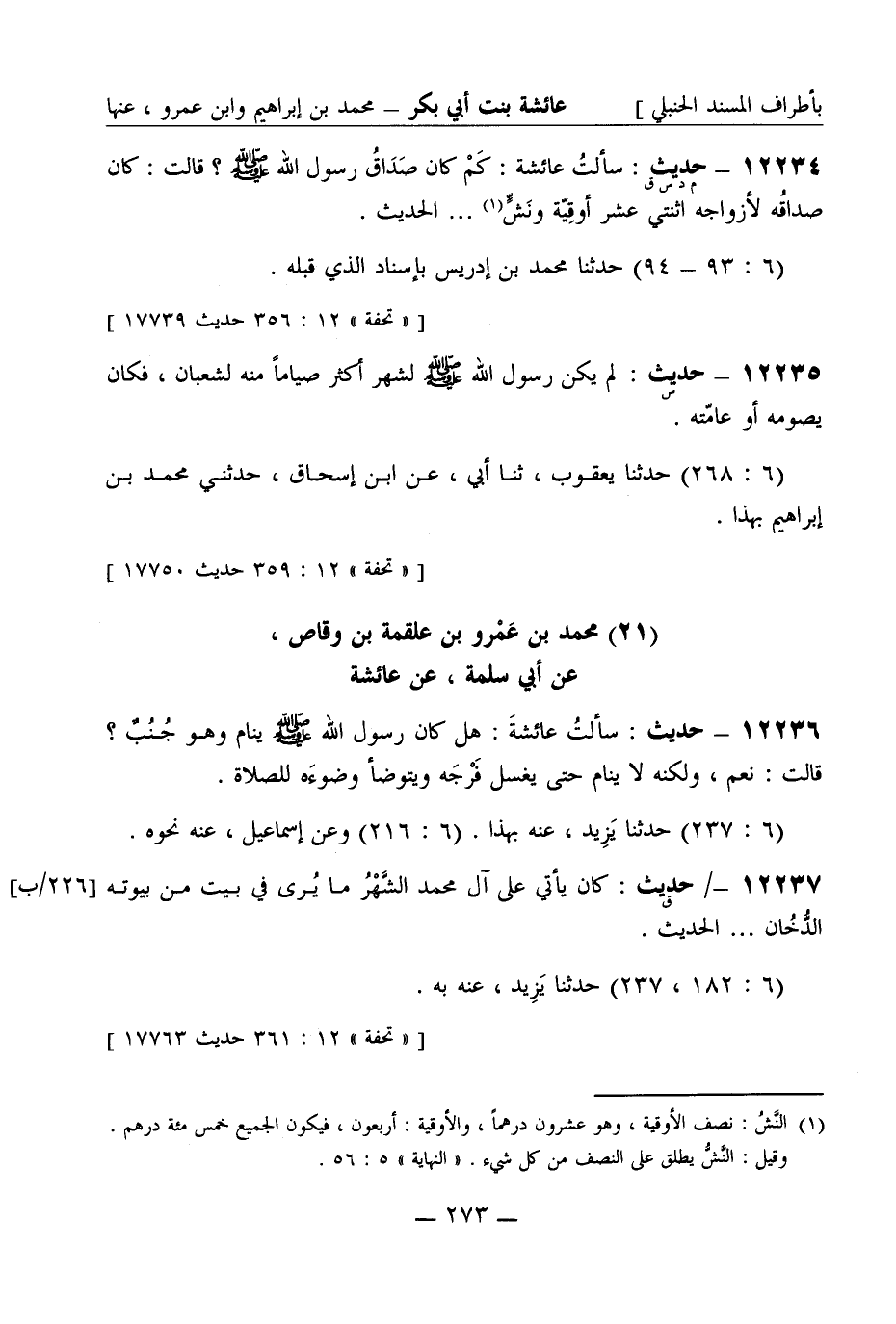 12234 -[م د س ق] حديث سألت عائشة كم كان صداق رسول الله صَلَّى اللَّهُ عَلَيْهِ وَسَلَّمَ قالت كان صداقه لأزواجه اثنتي عشر أوقية ونش ... . الحديث (6: 93 - 94) حدثنا محمد بن إدريس بإسناد الذي قبله