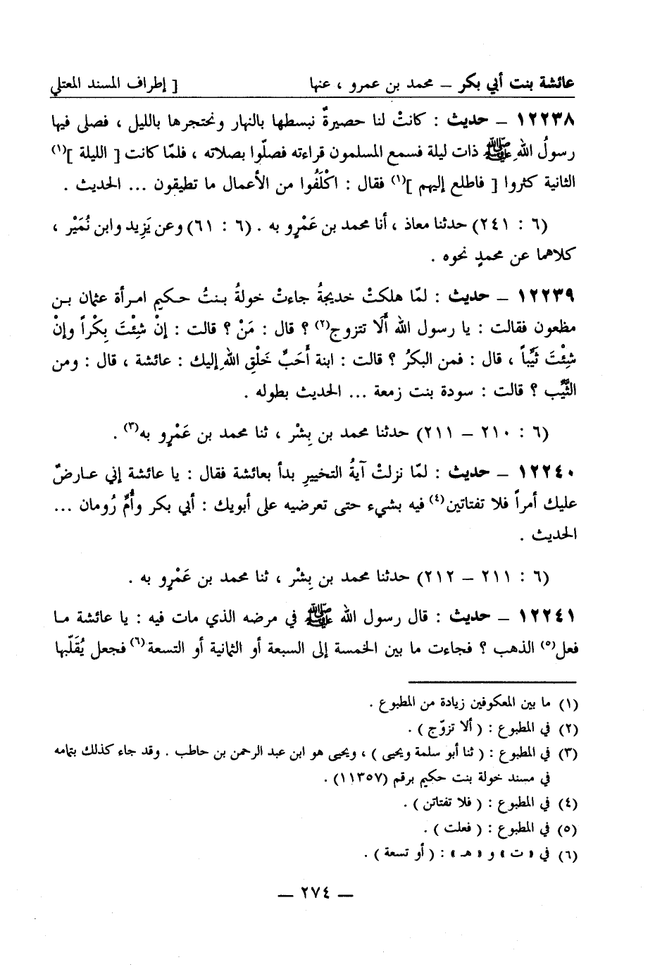 12240 - حديث لما نزلت آية التخيير بدأ بعائشة فقال يا عائشة إني عارض عليك أمرا فلا تفتاتين فيه بشيء حتى تعرضيه على أبويك أبي بكر وأم رومان ... . الحديث (6: 211 - 212) حدثنا محمد بن بشر ثنا محمد بن عمرو به