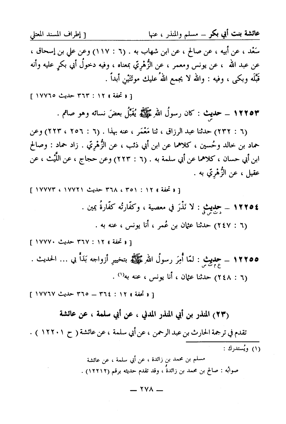 12253 -[س] حديث كان رسول الله صَلَّى اللَّهُ عَلَيْهِ وَسَلَّمَ يقبل بعض نسائه وهو صائم (6: 232) حدثنا عبد الرزاق ثنا معمر عنه بهذا (6: 256، 223) وعن حماد بن خالد وحسين كلاهما عن ابن أبي ذئب عن الزهري زاد حماد وصالح بن أبي حسان كلاهما عن أبي سلمة به (6: 223) وعن حجاج عن الليث عن عقيل عن الزهري به
