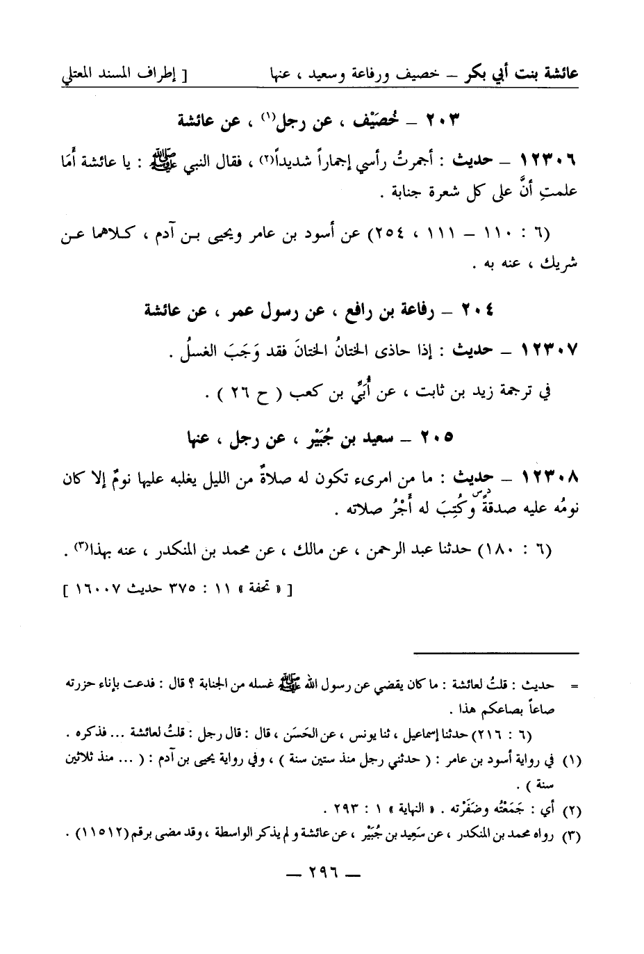 12306 - حديث أجمرت رأسي إجمارا شديدا فقال النبي صَلَّى اللَّهُ عَلَيْهِ وَسَلَّمَ يا عائشة أما علمت أن على كل شعرة جنابة (6: 110 - 111، 254) عن أسود بن عامر ويحيى بن آدم كلاهما عن شريك عنه به
