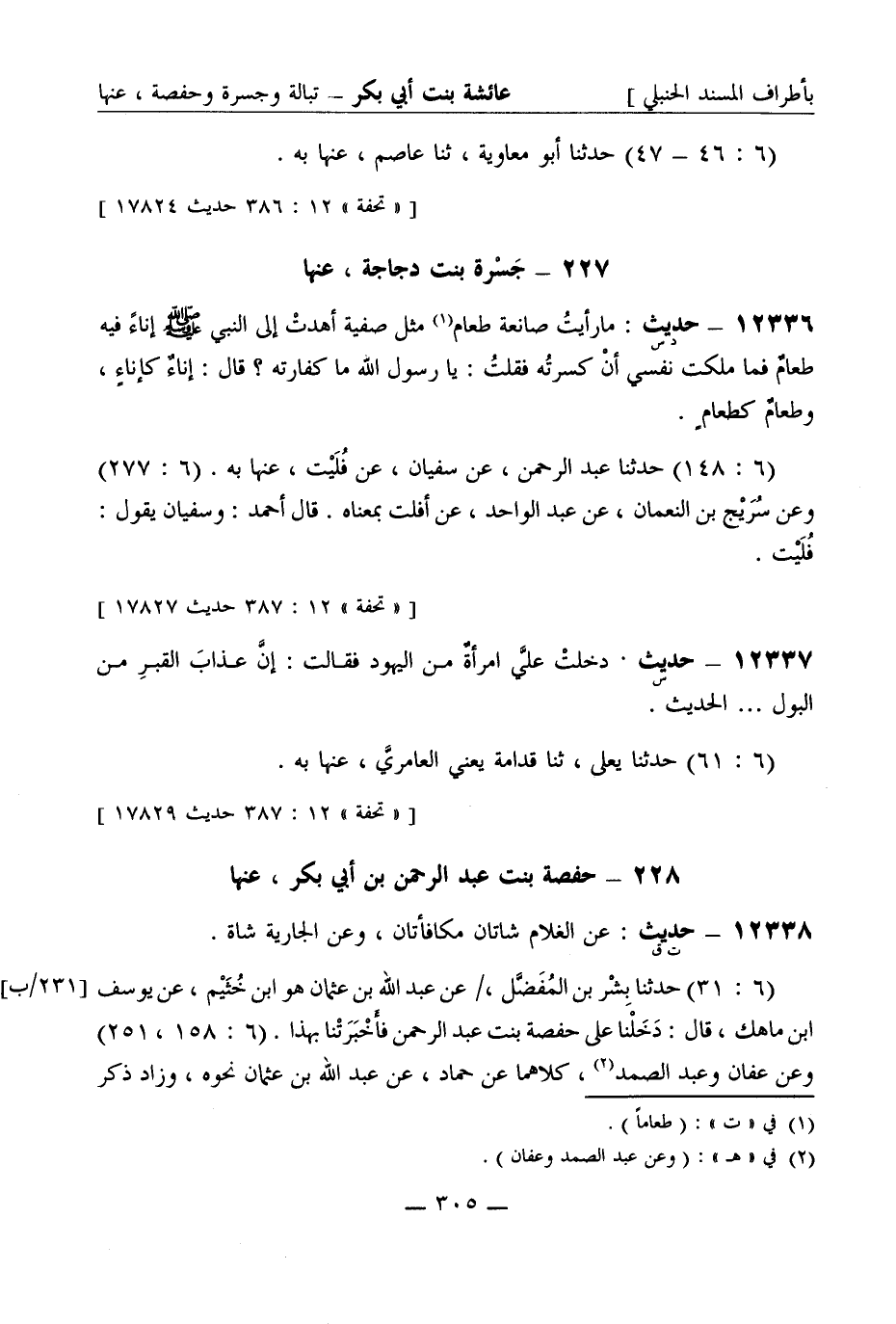 12338 -[ت ق] حديث عن الغلام شاتان مكافأتان وعن الجارية شاة (6: 31) حدثنا بشر بن المفضل عن عبد الله بن عثمان هو ابن خثيم عن يوسف بن ماهك قال دخلنا على حفصة بنت عبد الرحمن فأخبرتنا بهذا (6: 158، 251) وعن عفان وعبد الصمد كلاهما عن حماد عن عبد الله بن عثمان نحوه وزاد ذكر -[306]- الفرع خمس شياه