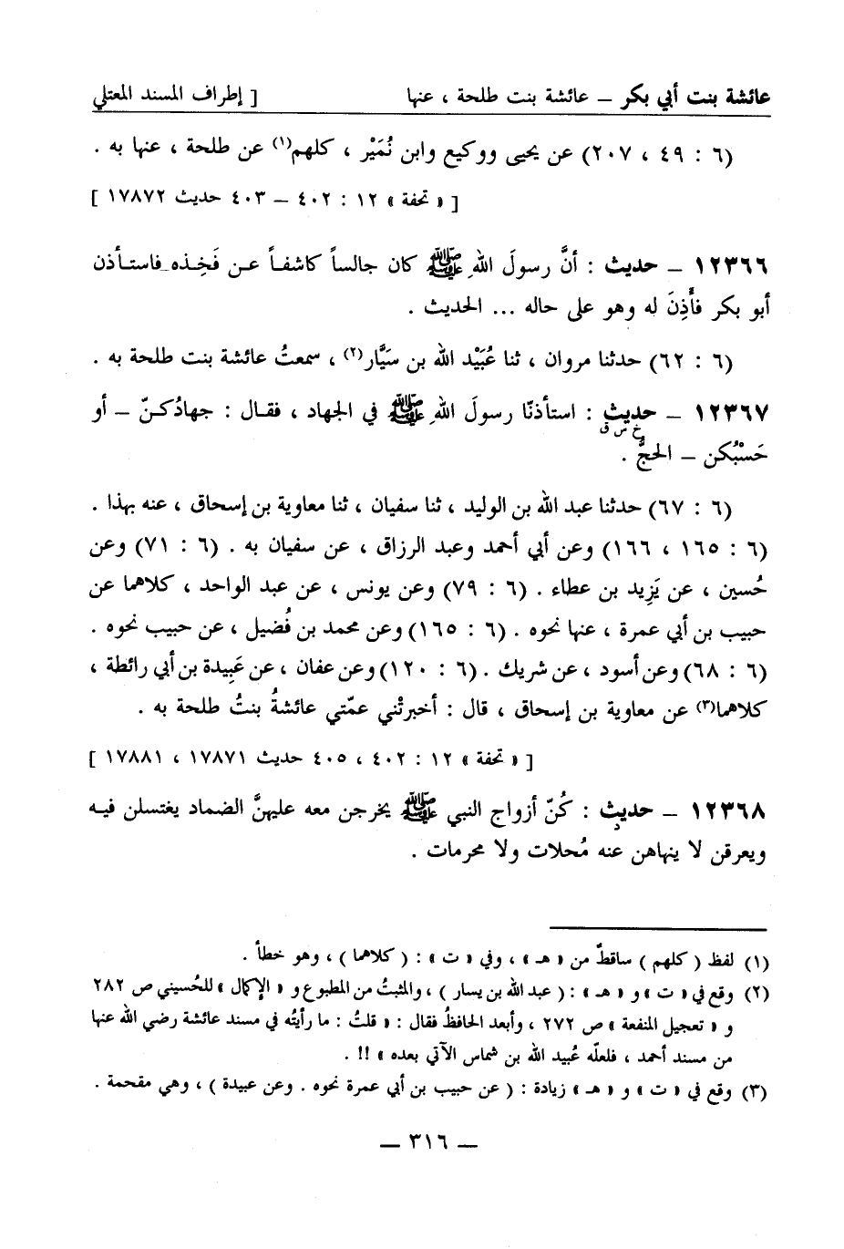 12367 -[خ س ق] حديث استأذنا رسول الله صَلَّى اللَّهُ عَلَيْهِ وَسَلَّمَ في الجهاد فقال جهادكن - أو حسبكن - الحج (6: 67) حدثنا عبد الله بن الوليد ثنا سفيان ثنا معاوية بن إسحاق عنه بهذا (6: 165، 166) وعن أبي أحمد وعبد الرزاق عن سفيان به (6: 71) وعن حسين عن يزيد بن عطاء (6: 79) وعن يونس عن عبد الواحد كلاهما عن حبيب بن أبي عمرة عنها نحوه (6: 165) وعن محمد بن فضيل عن حبيب نحوه (6: 68) وعن أسود عن شريك (6: 120) وعن عفان عن عبيدة بن أبي رائطة كلاهما عن معاوية بن إسحاق قال أخبرتني عمتي عائشة بنت طلحة به.