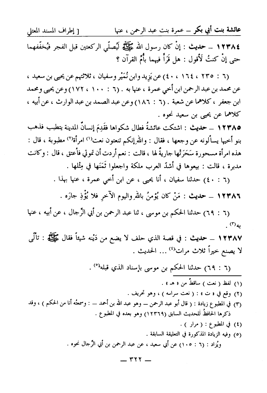 12384 - حديث إن كان رسول الله صَلَّى اللَّهُ عَلَيْهِ وَسَلَّمَ ليصلي الركعتين قبل الفجر فيخففهما حتى إن كنت لأقول هل قرأ فيهما بأم القرآن؟ (6: 235، 164، 40) عن يزيد وابن نمير وسفيان ثلاثتهم عن يحيى بن سعيد عن محمد بن عبد الرحمن ابن أخي عمرة عنها به (6: 100، 172) وعن يحيى ومحمد بن جعفر كلاهما عن شعبة (6: 186) وعن عبد الصمد بن عبد الوارث عن أبيه كلاهما عن يحيى بن سعيد نحوه