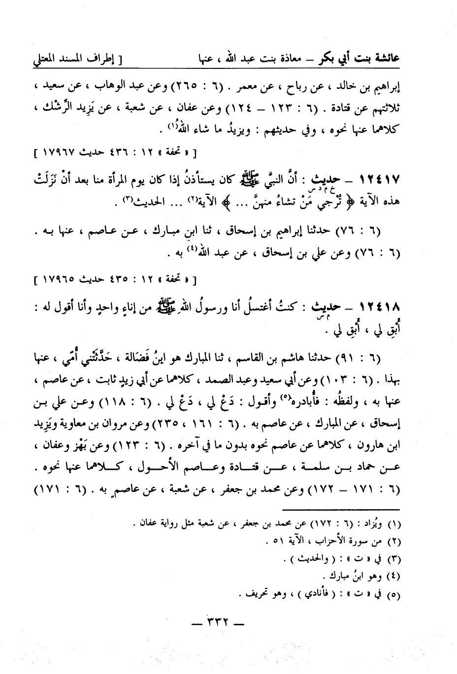12418 -[م س] حديث كنت أغتسل أنا ورسول الله صَلَّى اللَّهُ عَلَيْهِ وَسَلَّمَ من إناء واحد وأنا أقول له أبق لي أبق لي (6: 91) حدثنا هاشم بن القاسم ثنا المبارك هو ابن فضالة حدثتني أمي عنها بهذا (6: 103) وعن أبي سعيد وعبد الصمد كلاهما عن أبي زيد ثابت عن عاصم عنها به ولفظه فأبادره وأقول دع لي دع لي (6: 118) وعن علي بن بن إسحاق عن المبارك عن عاصم به (6: 161، 235) وعن مروان بن معاوية ويزيد بن هارون كلاهما عن عاصم نحوه بدون ما في آخره (6: 123) وعن بهز وعفان عن حماد بن سلمة عن قتادة وعاصم الأحول كلاهما عنها نحوه (6: 171 - 172) وعن محمد بن جعفر عن شعبة عن عاصم به -[333]- (6: 171) وعن محمد بن جعفر وعبد الوهاب كلاهما عن سعيد عن قتادة به (6: 172) وعن محمد بن جعفر عن شعبة عن يزيد الرشك عنها به وزاد يبدأ فيغسل يديه وفيه قول عائشة إن الماء لا ينجسه شيء