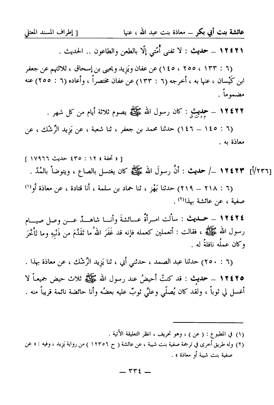 12421 - حديث لا تفنى أمتي إلا بالطعن والطاعون ... . الحديث (6: 133، 255، 145) عن عفان ويزيد ويحيى بن إسحاق ثلاثتهم عن جعفر بن كيسان عنها به أخرجه (6: 133) عن عفان مختصرا وأعاده (6: 255) عنه مضموما