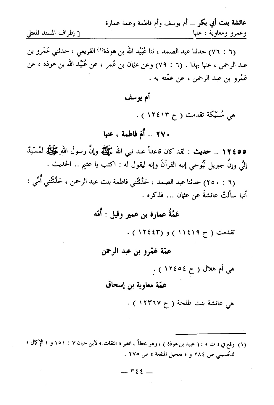 12455 - حديث لقد كان قاعدا عند نبي الله صَلَّى اللَّهُ عَلَيْهِ وَسَلَّمَ وإن رسول الله صَلَّى اللَّهُ عَلَيْهِ وَسَلَّمَ لمسند إلي وإن جبريل ليوحي إليه القرآن وإنه ليقول له اكتب يا عثيم ... . الحديث (6: 250) حدثنا عبد الصمد حدثتني فاطمة بنت عبد الرحمن حدثتني أمي أنها سألت عائشة عن عثمان ... فذكره عمة عمارة بن عمير وقيل أمه تقدمت (ح 11419) و (ح 12443) عمة عمرو بن عبد الرحمن هي أم هلال (ح 12454) عمة معاوية بن إسحاق هي عائشة بنت طلحة (ح 12367)