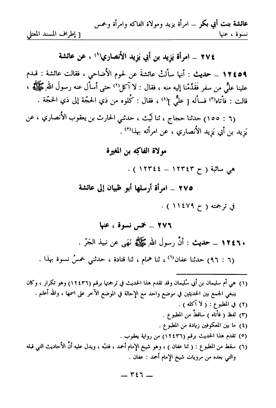 12460 - حديث أن رسول الله صَلَّى اللَّهُ عَلَيْهِ وَسَلَّمَ نهى عن نبيذ الجر (6: 96) حدثنا عفان ثنا همام ثنا قتادة حدثني خمس نسوة بهذا. -[347]- آخر مسند عائشة أم المؤمنين رضي الله عنها