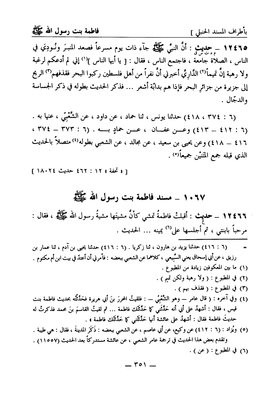 12466 -[ع] حديث: أقبلت فاطمة تمشي كأن مشيتها مشية رسول الله صَلَّى اللَّهُ عَلَيْهِ وَسَلَّمَ فقال مرحبا بابنتي ثم أجلسها على يمينه ... . الحديث -[352]- (6: 282) حدثنا أبو نعيم الفضل بن دكين ثنا زكريا بن أبي زائدة عن فراس عن الشعبي عن مسروق عن عائشة به (6: 282) وعن يزيد بن هارون عن إبراهيم بن سعد عن أبيه عن عروة عن عائشة قالت لما مرض النبي صَلَّى اللَّهُ عَلَيْهِ وَسَلَّمَ دعا ابنته فاطمة فسارها فبكت ... فذكره مختصرا (6: 283) وعن عبد الرزاق عن محمد بن راشد عن جعفر بن عمرو بن أمية قال دخلت فاطمة على أبي بكر فقالت أخبرني رسول الله صَلَّى اللَّهُ عَلَيْهِ وَسَلَّمَ أني أول أهله لحوقا به