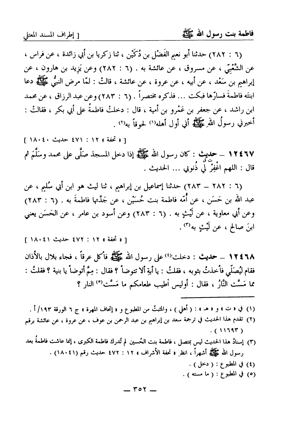 12467 -[ت ق] حديث كان رسول الله صَلَّى اللَّهُ عَلَيْهِ وَسَلَّمَ إذا دخل المسجد صلى على محمد وسلم ثم قال اللهم اغفر لي ذنوبي ... . الحديث (6: 282 - 283) حدثنا إسماعيل بن إبراهيم ثنا ليث هو ابن أبي سليم عن عبد الله بن حسن عن أمه فاطمة بنت حسين عن جدتها فاطمة به (6: 283) وعن أبي معاوية عن ليث به (6: 283) وعن أسود بن عامر عن الحسن يعني ابن صالح عن ليث به