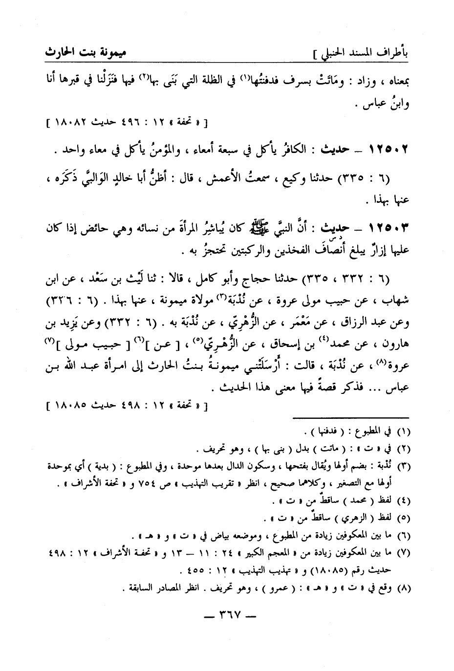 12503 -[د س] حديث أن النبي صَلَّى اللَّهُ عَلَيْهِ وَسَلَّمَ كان يباشر المرأة من نسائه وهي حائض إذا كان عليها إزار يبلغ أنصاف الفخذين والركبتين تحتجز به (6: 332، 335) حدثنا حجاج وأبو كامل قالا ثنا ليث بن سعد عن ابن شهاب عن حبيب مولى عروة عن ندبة مولاة ميمونة، عنها بهذا (6: 336) وعن عبد الرزاق، عن معمر، عن الزهري، عن ندبة به. (6: 332) وعن يزيد بن هارون عن محمد بن إسحاق عن الزهري [عن] [حبيب مولى] عروة عن ندبة قالت أرسلتني ميمونة بنت الحارث إلى امرأة عبد الله بن عباس ... فذكر قصة فيها معنى هذا الحديث