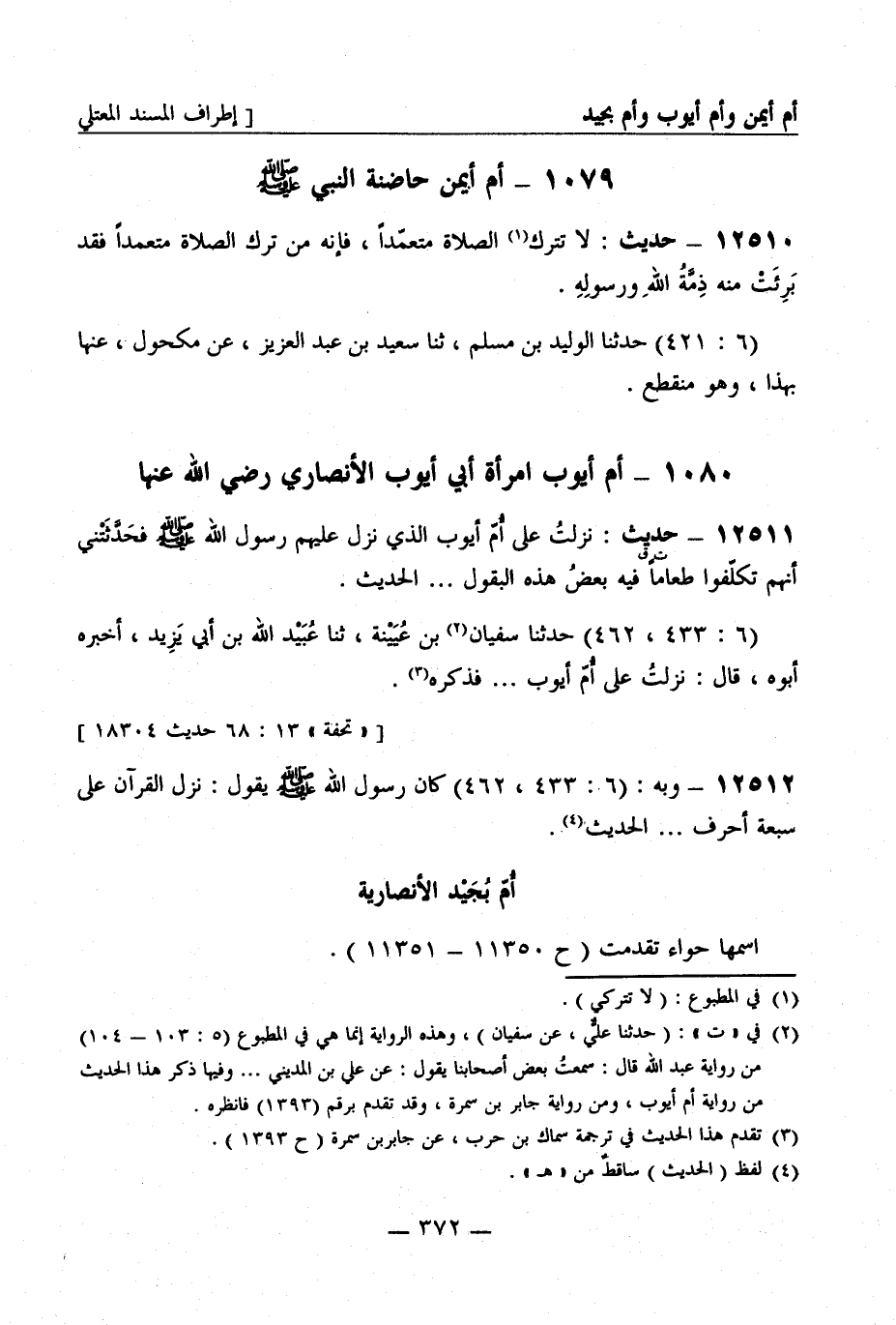 12513 - وبه (6: 433، 462) كان رسول الله صَلَّى اللَّهُ عَلَيْهِ وَسَلَّمَ يقول نزل القرآن على سبعة أحرف ... . الحديث أم بجيد الأنصارية اسمها حواء تقدمت (ح 11350 - 11351)