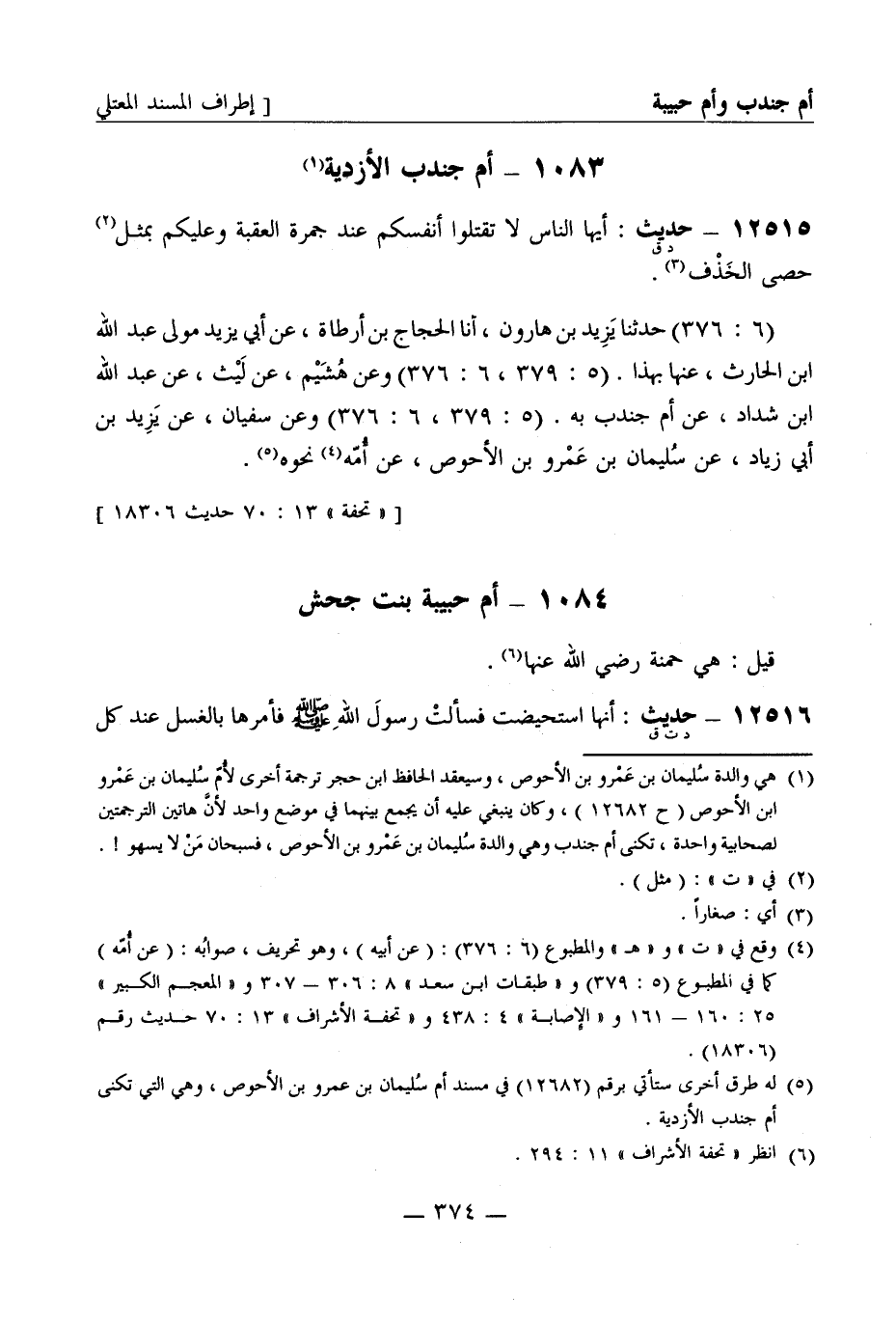 12516 -[د ق] حديث أيها الناس لا تقتلوا أنفسكم عند جمرة العقبة وعليكم بمثل حصى الخذف (6: 376) حدثنا يزيد بن هارون أنا الحجاج بن أرطاة عن أبي يزيد مولى عبد الله بن الحارث عنها بهذا (5: 379، 6: 376) وعن هشيم عن ليث عن عبد الله بن شداد، عن أم جندب به (5: 379، 6: 376) وعن سفيان عن يزيد بن أبي زياد عن سليمان بن عمرو بن الأحوص عن أمه نحوه