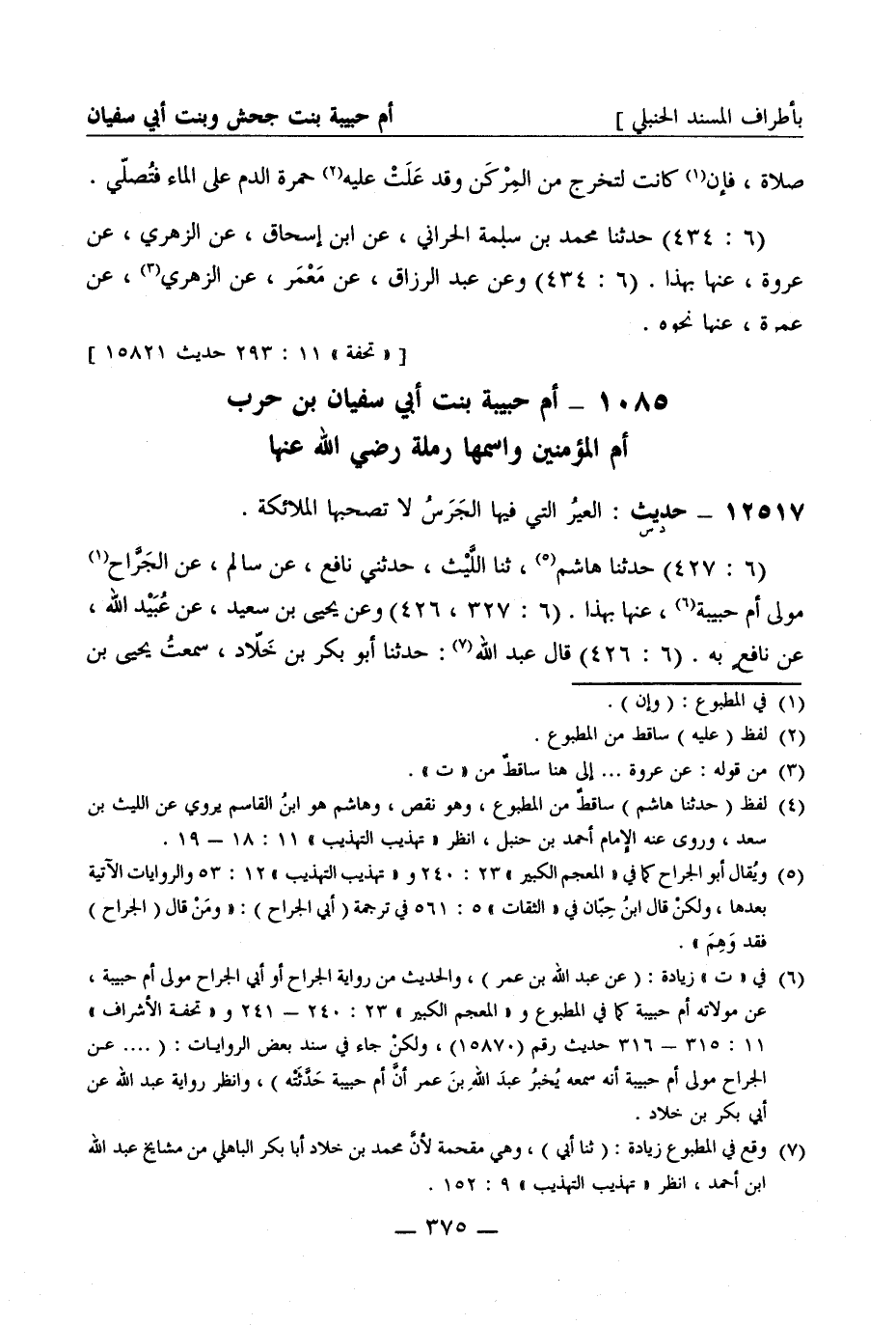 12518 -[د س] حديث: العير التي فيها الجرس لا تصحبها الملائكة (6: 427) حدثنا هاشم ثنا الليث حدثني نافع عن سالم عن الجراح مولى أم حبيبة عنها بهذا (6: 327، 426) وعن يحيى بن سعيد عن عبيد الله عن نافع به (6: 426) قال عبد الله حدثنا أبو بكر بن خلاد سمعت يحيى بن -[376]- سعيد قال حدث سفيان عن عبيد الله بن عمر عن نافع عن ابن عمر بهذا قال يحيى: فقلت له تعست يا أبا عبد الله قال لي كيف هو؟ قلت: حدثني عبيد الله عن نافع عن سالم عن أبي الجراح عن أم حبيبة به فقال صدقت (6: 426) وعن عبيدة بن حميد عن عبيد الله به (6: 327) وعن عبد الرحمن عن مالك عن نافع به (6: 326) وعن يعقوب عن أبيه عن يزيد بن الهاد عن سالم بن عبد الله به (6: 326) وعن أبي اليمان أنا شعيب قال قال نافع به