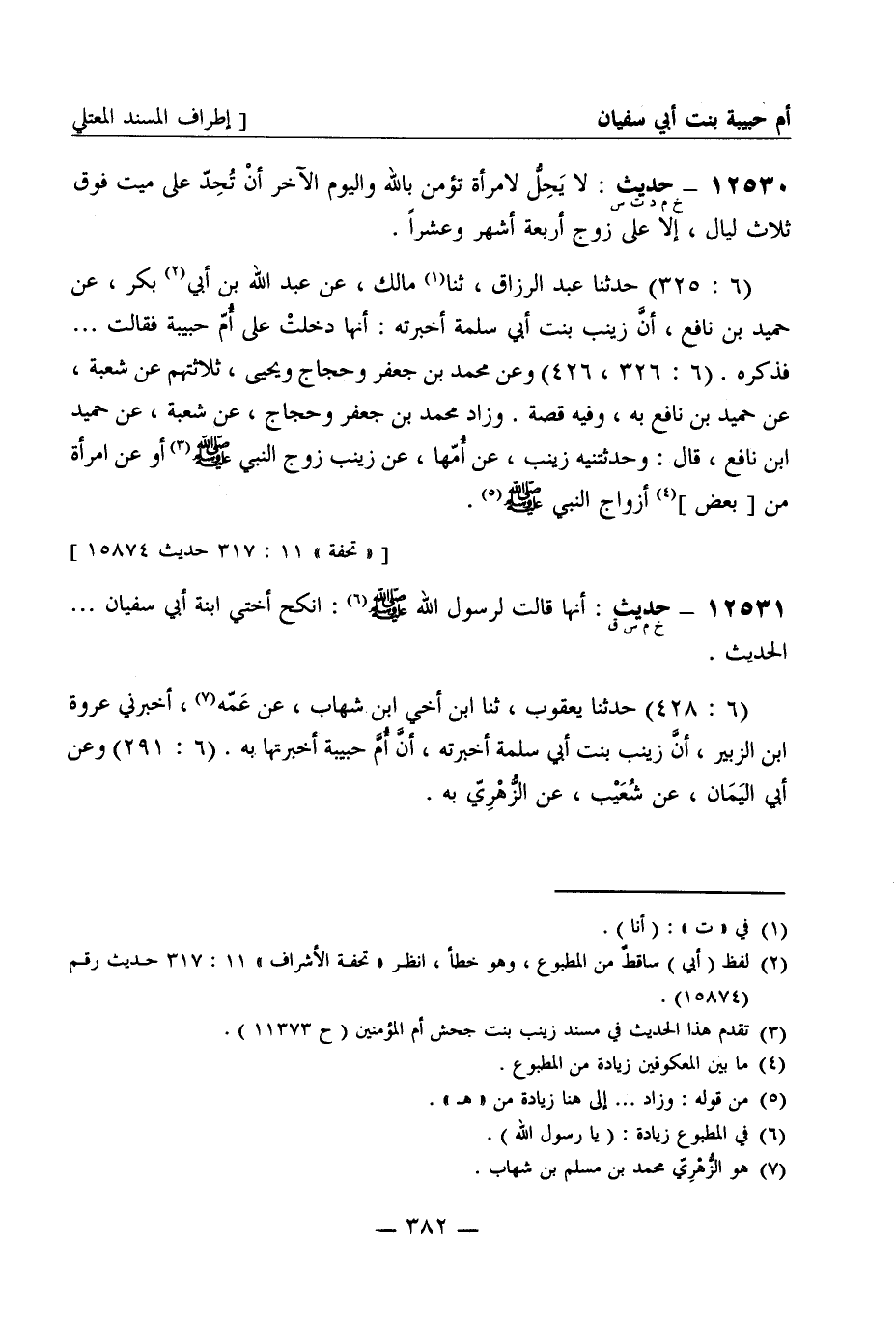 12531 -[خ م د ت س] حديث لا يحل لامرأة تؤمن بالله واليوم الآخر أن تحد على ميت فوق ثلاث ليال إلا على زوج أربعة أشهر وعشرا (6: 325) حدثنا عبد الرزاق ثنا مالك عن عبد الله بن أبي بكر عن حميد بن نافع أن زينب بنت أبي سلمة أخبرته أنها دخلت على أم حبيبة فقالت ... ... فذكره. (6: 326، 426) وعن محمد بن جعفر وحجاج ويحيى ثلاثتهم عن شعبة عن حميد بن نافع به وفيه قصة وزاد محمد بن جعفر وحجاج عن شعبة عن حميد بن نافع قال وحدثتنيه زينب عن أمها عن زينب زوج النبي صَلَّى اللَّهُ عَلَيْهِ وَسَلَّمَ أو عن امرأة من [بعض] أزواج النبي صَلَّى اللَّهُ عَلَيْهِ وَسَلَّمَ.
