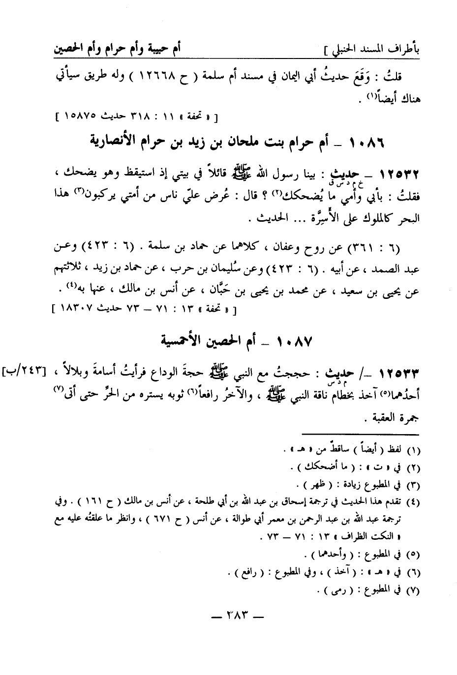12533 -[خ م د س ق] حديث بينا رسول الله صَلَّى اللَّهُ عَلَيْهِ وَسَلَّمَ قائلا في بيتي إذ استيقظ وهو يضحك فقلت بأبي وأمي ما يضحكك؟ قال عرض علي ناس من أمتي يركبون هذا البحر كالملوك على الأسرة ... . الحديث (6: 361) عن روح وعفان كلاهما عن حماد بن سلمة (6: 423) وعن عبد الصمد عن أبيه (6: 423) وعن سليمان بن حرب عن حماد بن زيد ثلاثتهم عن يحيى بن سعيد عن محمد بن يحيى بن حبان عن أنس بن مالك عنها به