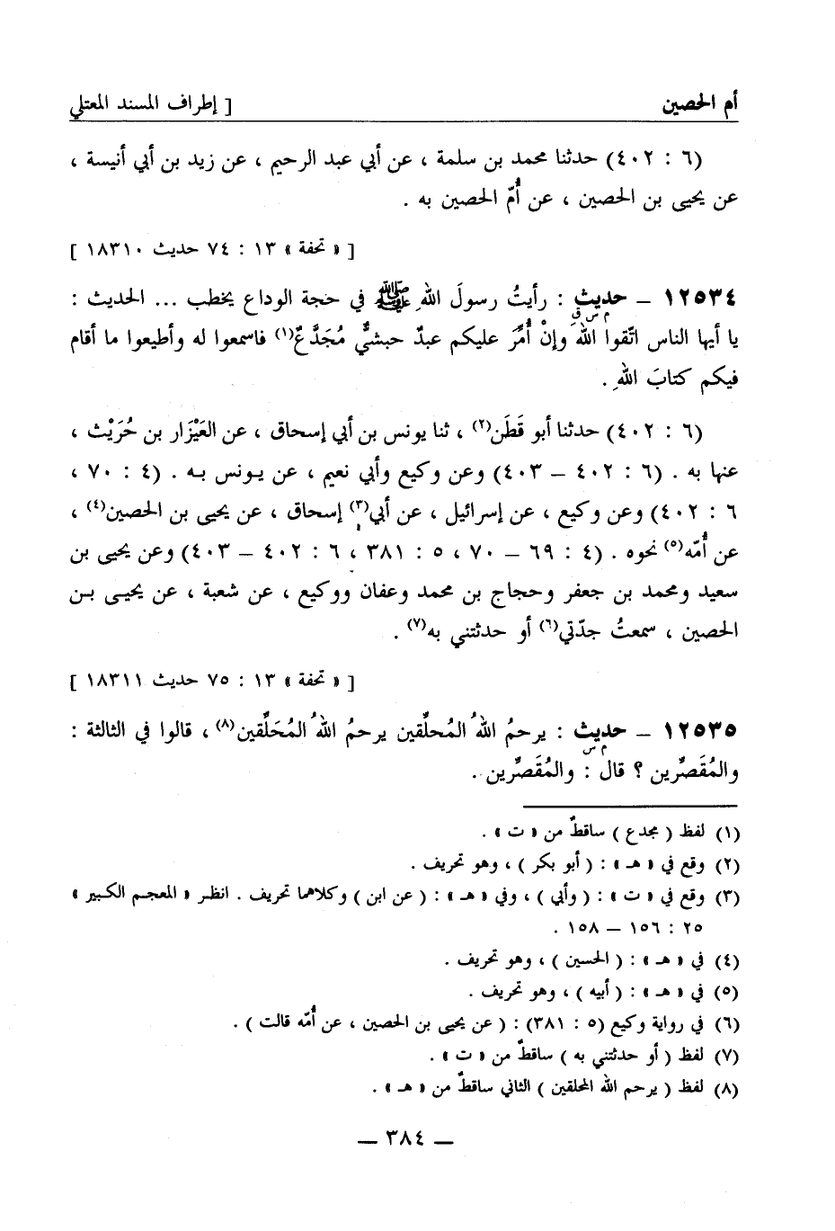 12536 -[م س] حديث يرحم الله المحلقين يرحم الله المحلقين قالوا في الثالثة والمقصرين قال والمقصرين -[385]- (لم أجده) عن وكيع وروح عن إسرائيل عن أبي إسحاق عن يحيى بن حصين حدثتني جدتي به (4: 70، 5: 381، 6: 402، 403) وعن وكيع وروح وحجاج ثلاثتهم [عن شعبة] عن ابن حصين به.
