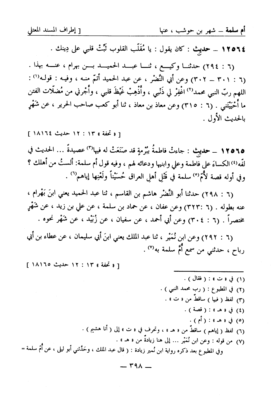 12565 -[ت] حديث كان يقول يا مقلب القلوب ثبت قلبي على دينك (6: 294) حدثنا وكيع ثنا عبد الحميد بن بهرام عنه بهذا (6: 301 - 302) وعن أبي النضر عن عبد الحميد أتم منه وفيه قوله: اللهم رب النبي محمد اغفر لي ذنبي وأذهب غيظ قلبي وأجرني من مضلات الفتن ما أحييتني (6: 315) وعن معاذ بن معاذ ثنا أبو كعب صاحب الحرير عن شهر بالحديث الأول