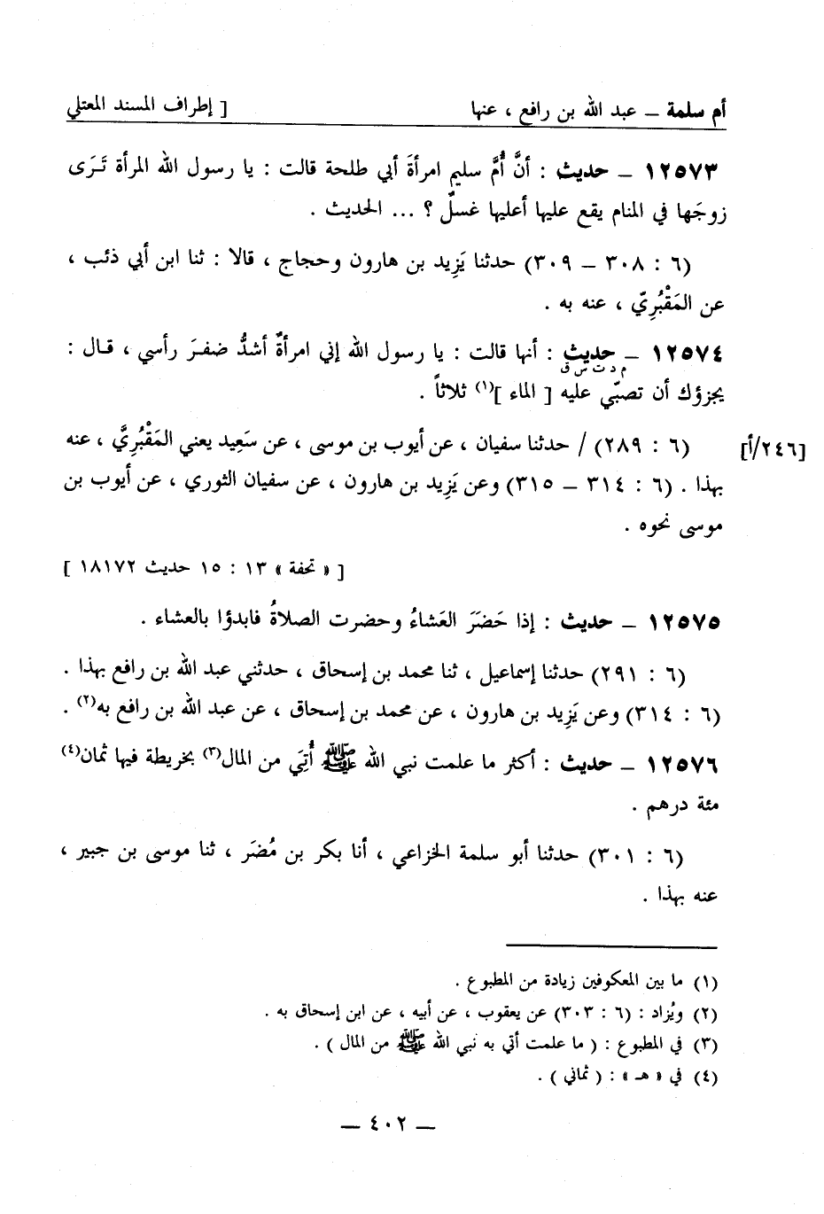 12575 -[م د ت س ق] حديث أنها قالت يا رسول الله إني امرأة أشد ضفر رأسي قال يجزؤك أن تصبي عليه [الماء] ثلاثا (6: 289) حدثنا سفيان عن أيوب بن موسى عن سعيد يعني المقبري عنه بهذا (6: 314 - 315) وعن يزيد بن هارون عن سفيان الثوري عن أيوب بن موسى نحوه