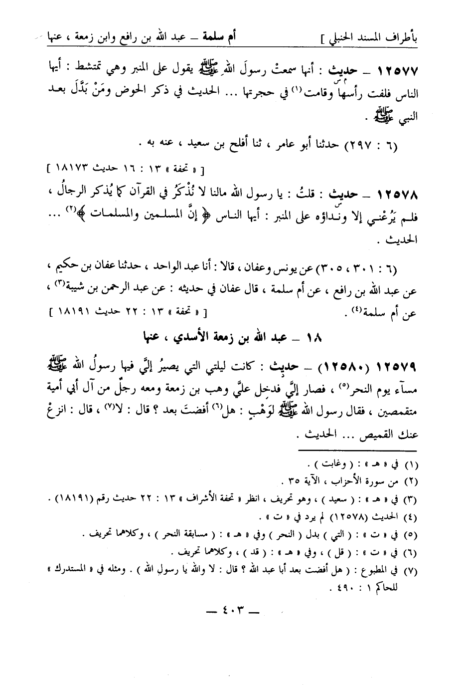 12580 - (12580) - (د) حديث كانت ليلتي التي يصير إلي فيها رسول الله صَلَّى اللَّهُ عَلَيْهِ وَسَلَّمَ مساء يوم النحر فصار إلي فدخل علي وهب بن زمعة ومعه رجل من آل أبي أمية متقمصين فقال رسول الله صَلَّى اللَّهُ عَلَيْهِ وَسَلَّمَ لوهب هل أفضت بعد؟ قال لا قال انزع عنك القميص ... . الحديث -[404]- (6: 295) حدثنا محمد بن أبي عدي عن محمد بن إسحاق حدثني أبو عبيدة بن عبد الله بن زمعة عن أبيه وعن أمه زينب بنت أبي سلمة يحدثانه بذلك جميعا عن أم سلمة قال أبو عبيدة وحدثتني أم قيس بنت محصن وكانت جارة لهم قالت خرج من عندي عكاشة بن محصن في نفر من بني أسد متقمصين ... . الحديث (6: 303) وعن يعقوب عن أبيه عن ابن إسحاق دون حديث أم قيس (6: 303) وبه عن ابن إسحاق حدثني محمد بن جعفر بن الزبير عن يزيد بن رومان عن خالد مولى الزبير بن نوفل حدثتنيه زينب بنت أبي سلمة