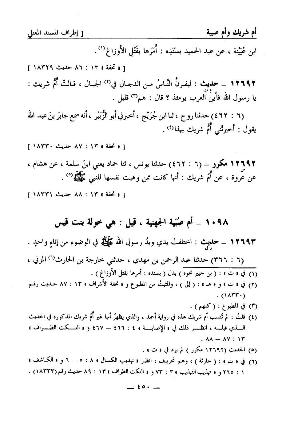 12692 -[م ت] حديث: ليفرن الناس من الدجال في الجبال قالت أم شريك يا رسول الله فأين العرب يومئذ؟ قال: هم قليل. (6: 462) حدثنا روح ثنا ابن جريج أخبرني أبو الزبير أنه سمع جابر بن عبد الله يقول أخبرتني أم شريك بهذا
