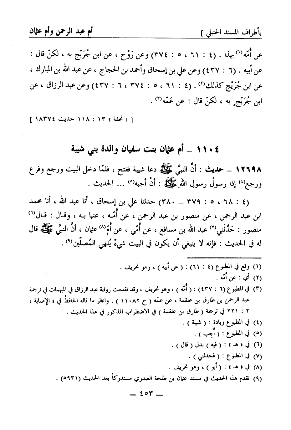 12698 - حديث: أن النبي صَلَّى اللَّهُ عَلَيْهِ وَسَلَّمَ دعا شيبة ففتح فلما دخل البيت ورجع وفرغ ورجع إذا رسول رسول الله صَلَّى اللَّهُ عَلَيْهِ وَسَلَّمَ: أن أجبه ... . الحديث (4: 68، 5: 379 - 380) حدثنا علي بن إسحاق أنا عبد الله أنا محمد بن عبد الرحمن عن منصور بن عبد الرحمن عن أمه عنها به وقال قال منصور حدثني عبد الله بن مسافع عن أمي عن أم عثمان أن النبي صَلَّى اللَّهُ عَلَيْهِ وَسَلَّمَ قال له في الحديث فإنه لا ينبغي أن يكون في البيت شيء يلهي المصلين