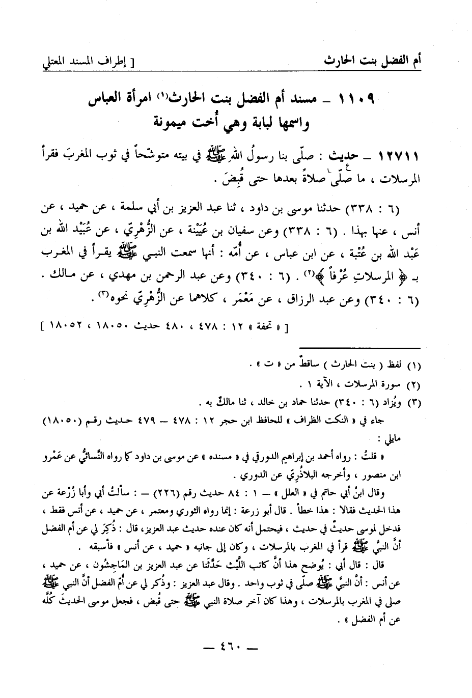 12711 -[ع] حديث صلى بنا رسول الله صَلَّى اللَّهُ عَلَيْهِ وَسَلَّمَ في بيته متوشحا في ثوب المغرب فقرأ المرسلات، ما صلى صلاة بعدها حتى قبض. (6: 338) حدثنا موسى بن داود، ثنا عبد العزيز بن أبي سلمة، عن حميد عن أنس عنها بهذا (6: 338) وعن سفيان بن عيينة عن الزهري عن عبيد الله بن عبد الله بن عتبة عن ابن عباس عن أمه: أنها سمعت النبي صَلَّى اللَّهُ عَلَيْهِ وَسَلَّمَ يقرأ في المغرب ب المرسلات عرفا (6: 340) وعن عبد الرحمن بن مهدي عن مالك (6: 340) وعن عبد الرزاق عن معمر كلاهما عن الزهري نحوه