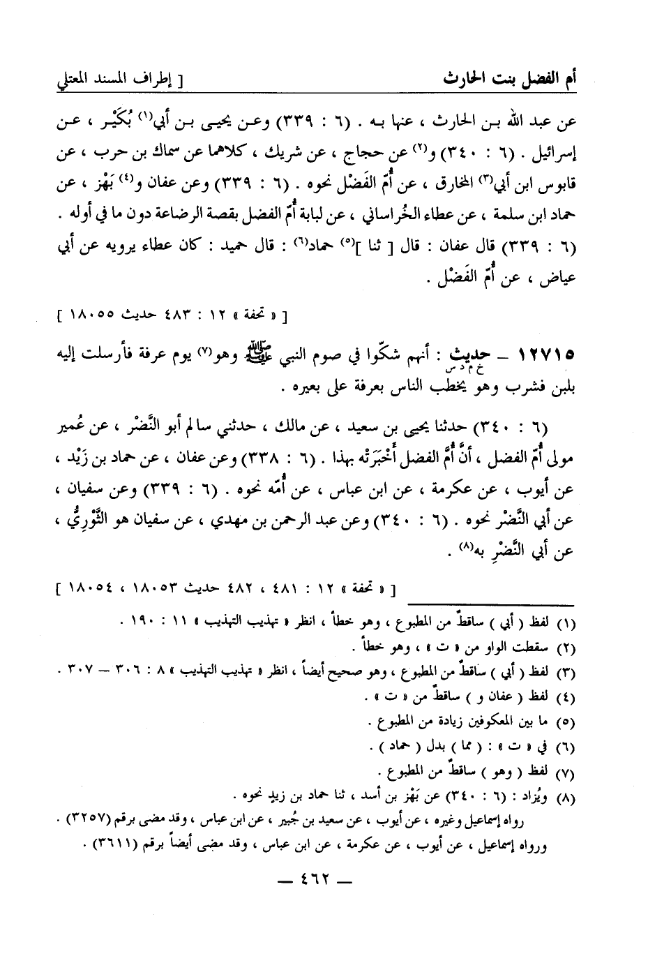 12715 -[خ م د س] حديث أنهم شكوا في صوم النبي صَلَّى اللَّهُ عَلَيْهِ وَسَلَّمَ وهو يوم عرفة فأرسلت إليه بلبن فشرب وهو يخطب الناس بعرفة على بعيره (6: 340) حدثنا يحيى بن سعيد عن مالك حدثني سالم أبو النضر عن عمير مولى أم الفضل أن أم الفضل أخبرته بهذا (6: 338) وعن عفان عن حماد بن زيد عن أيوب عن عكرمة عن ابن عباس عن أمه نحوه (6: 339) وعن سفيان عن أبي النضر نحوه (6: 340) وعن عبد الرحمن بن مهدي عن سفيان هو الثوري عن أبي النضر به